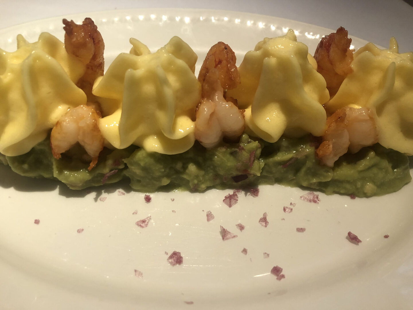 Como rico está también el timbal de tartar de ahumados con salmón marinado y anguila con patata y huevo roto, una combinación de mar y montaña perfecta. Los langostinos salteados con guacamole y espuma de mango me encantan. Es una mezcla del sabor del langostino con la acidez del mango y el toque del guacamole que te proporciona una deliciosa frescura en cada bocado.