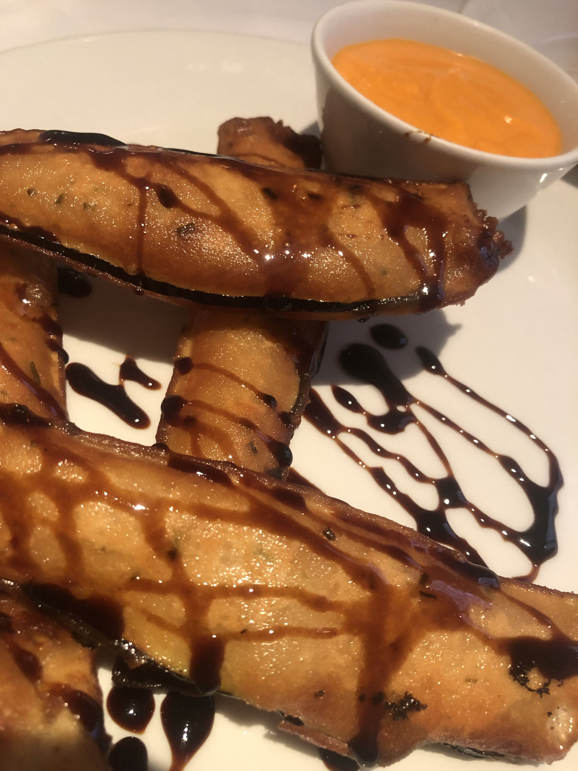 Y de influencia andaluza probamos unas berenjenas con miel de caña y salmorejo (entera 10,50€ y media 6,80€). Aunque no son las de la Taberna de la Niña del Pisto de Marbella, para mí las mejores, sí que están muy buenas, con un toque crujiente por fuera y esponjosas por dentro, acompañadas muy bien con las salsas, así que recomiendo pedirlas.