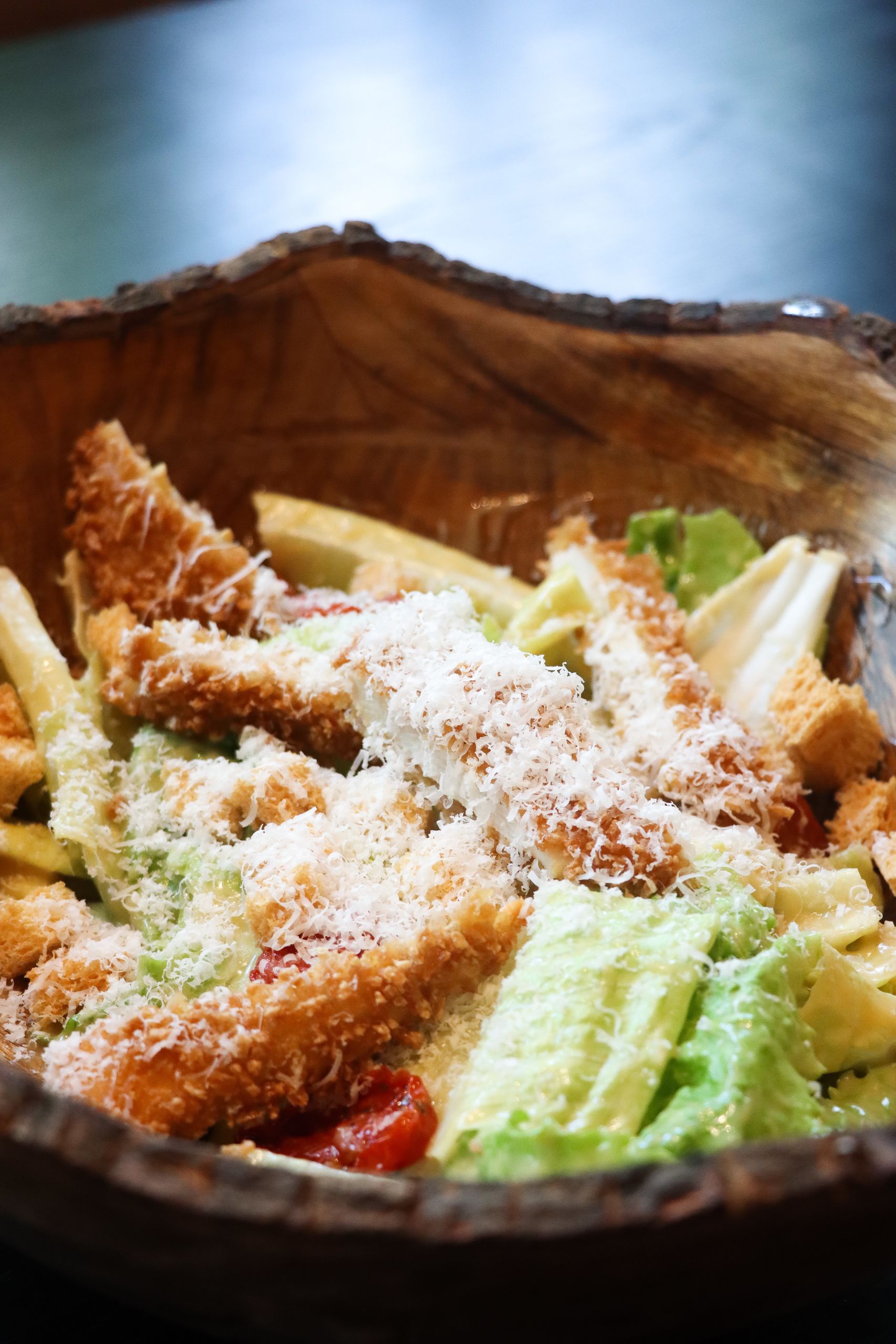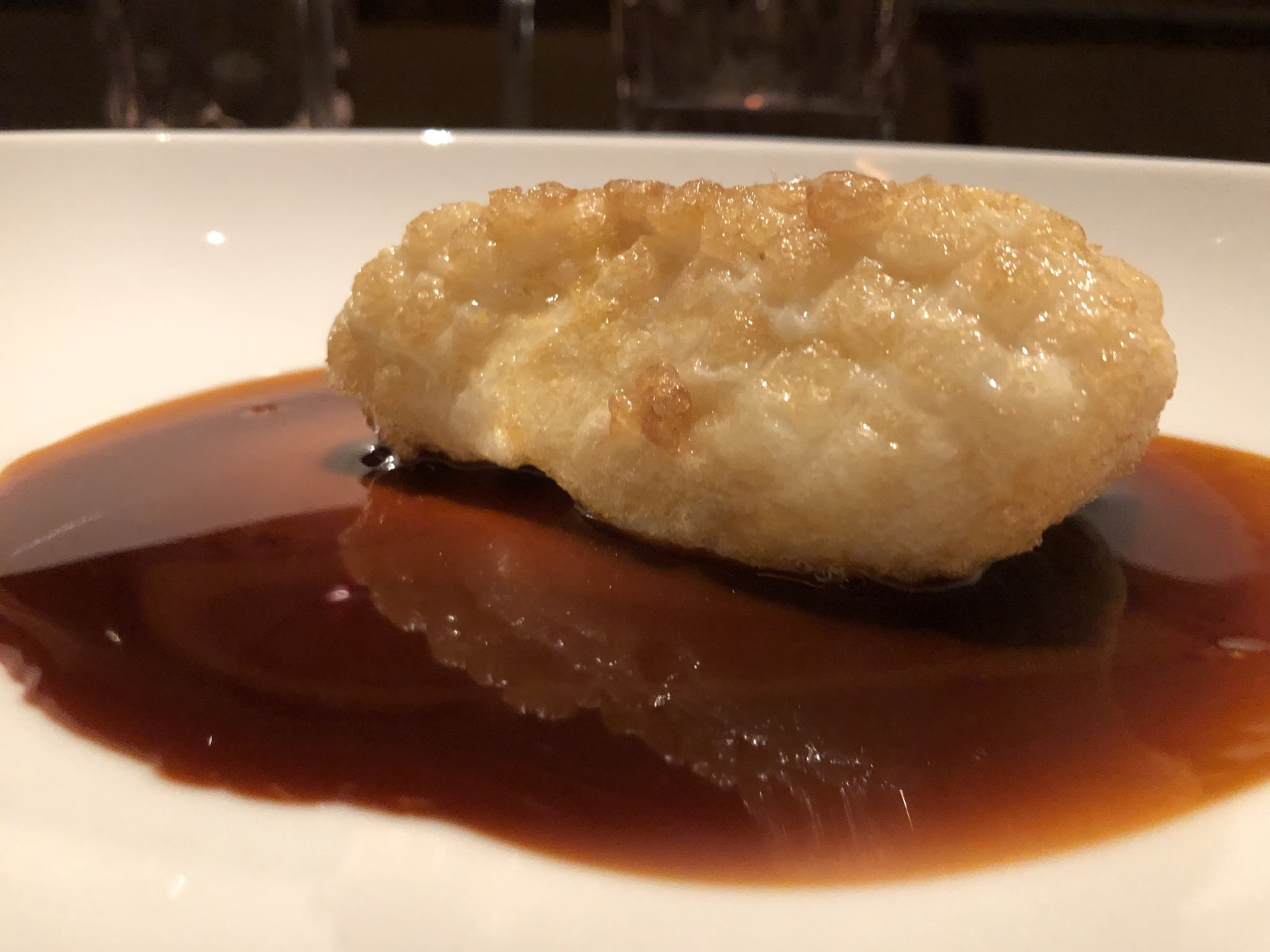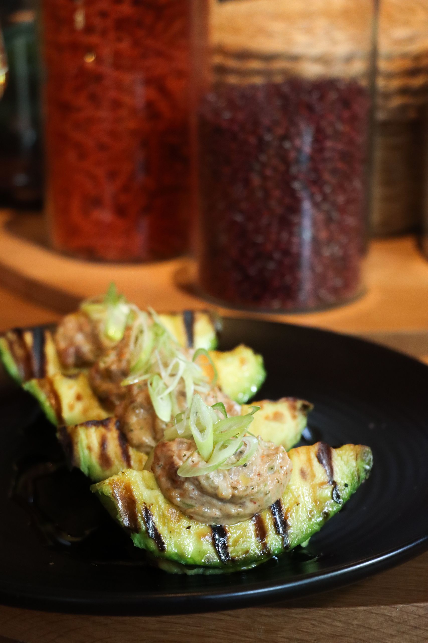 Brutales flores de calabacín en tempura, queso viejo y emulsión de miel y pimentón. Con un rebozado muy suave que casi ni se nota y le aporta el toque crujiente perfecto. La verdura se las proporciona a diario uno de sus productores de km0.