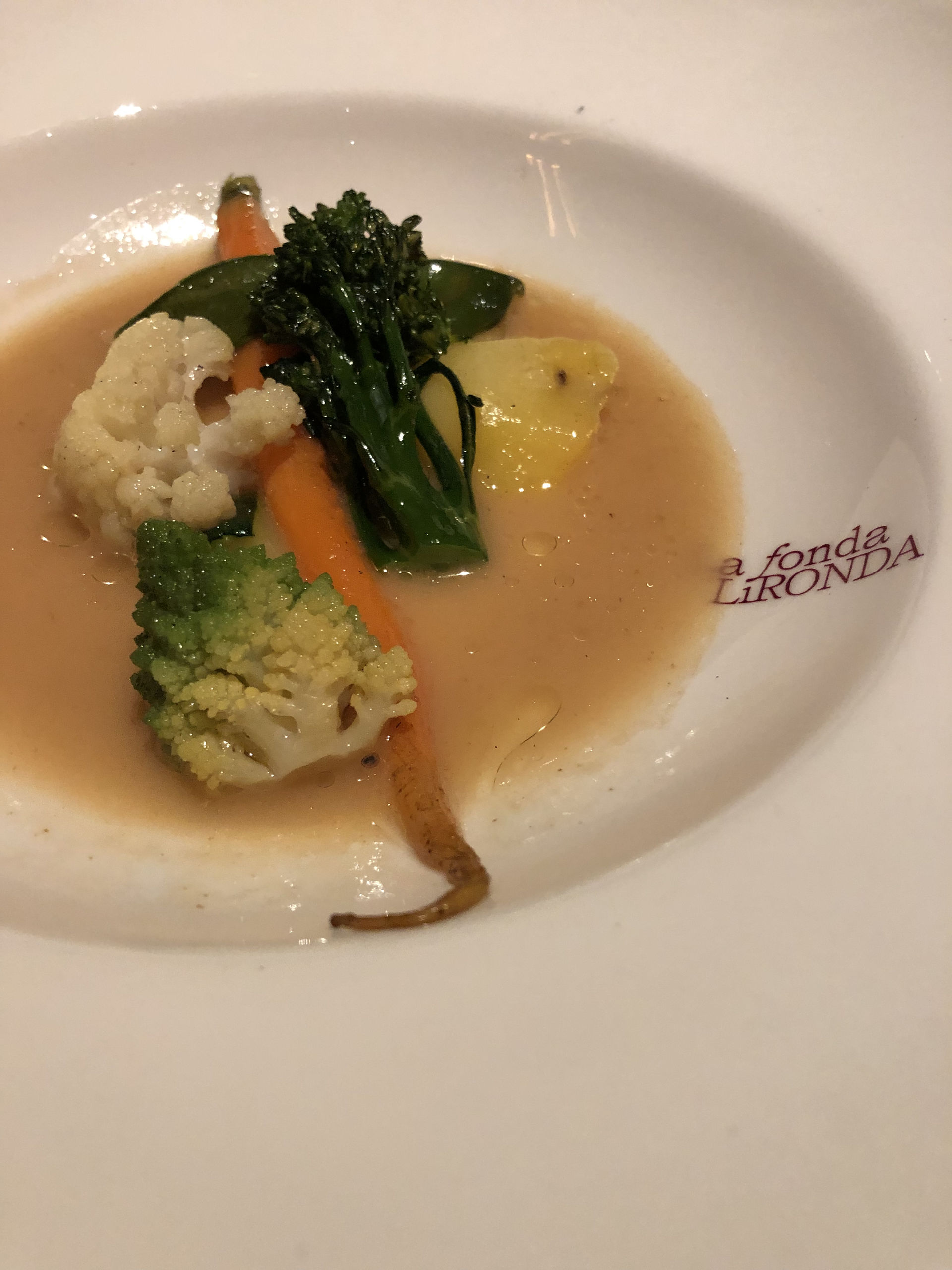 Espectacular menestra de verduras a la brasa y jugo ligado de jamón ibérico, sobre todo por ese fondo de jugo de jamón ibérico de La Fonda Lironada.