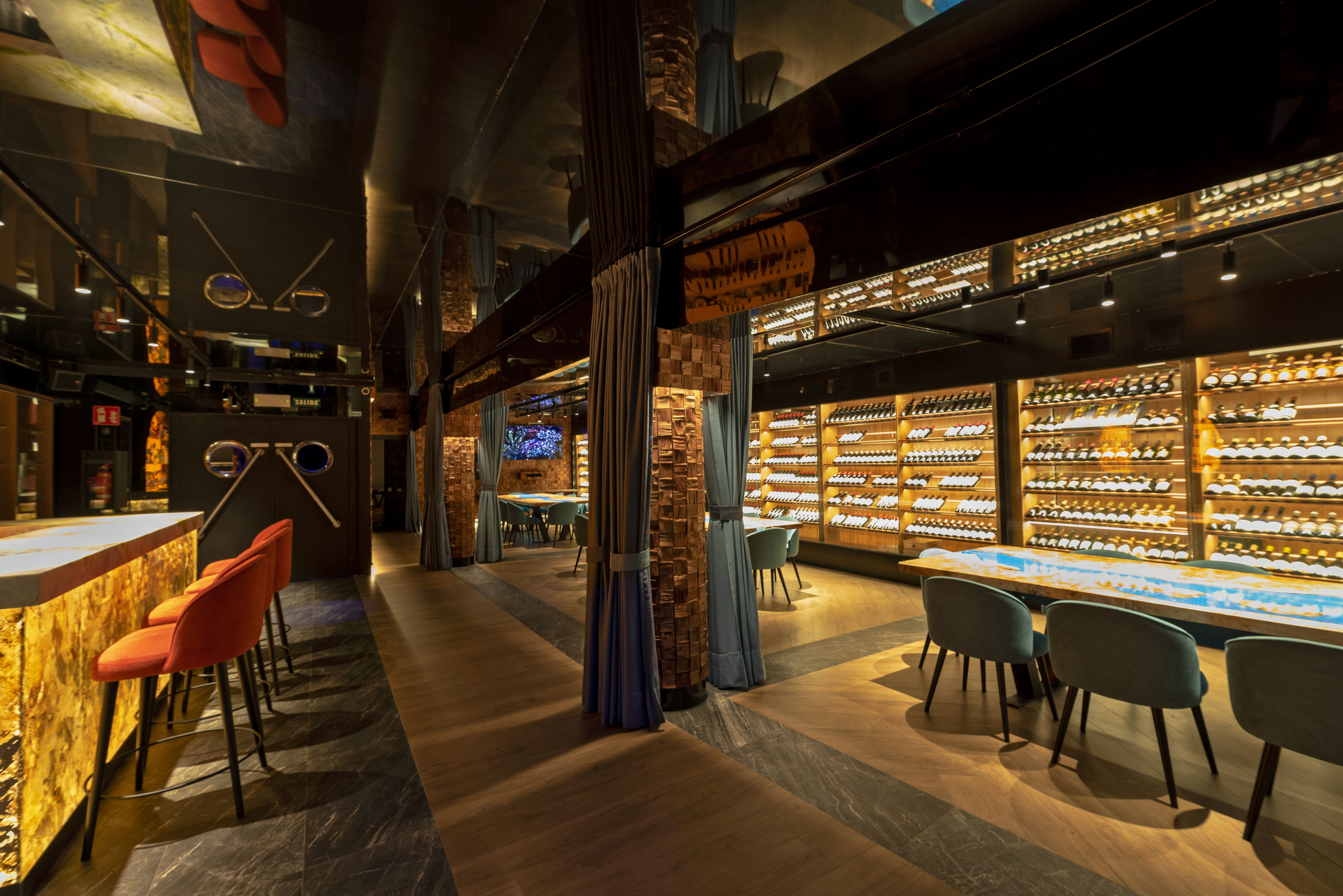 Un sushi bar realizado en ónix rojo contrasta con el llamativo mármol luminious de las barras de coctelería. El alabastro resalta en elementos estratégicamente situados, como lavabos y recepción.