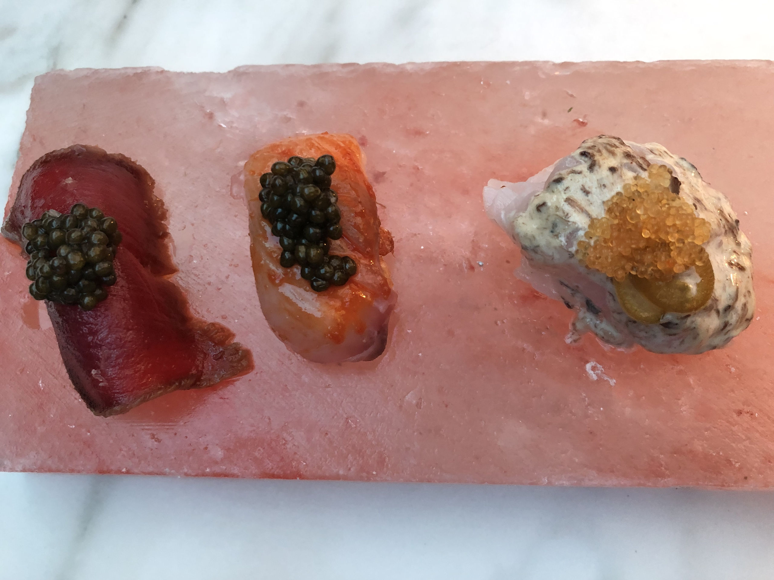 Niguiris de Quintoelemento: de suke de atún, de hamachi con caviar y espectacular el de vieira con trufa.