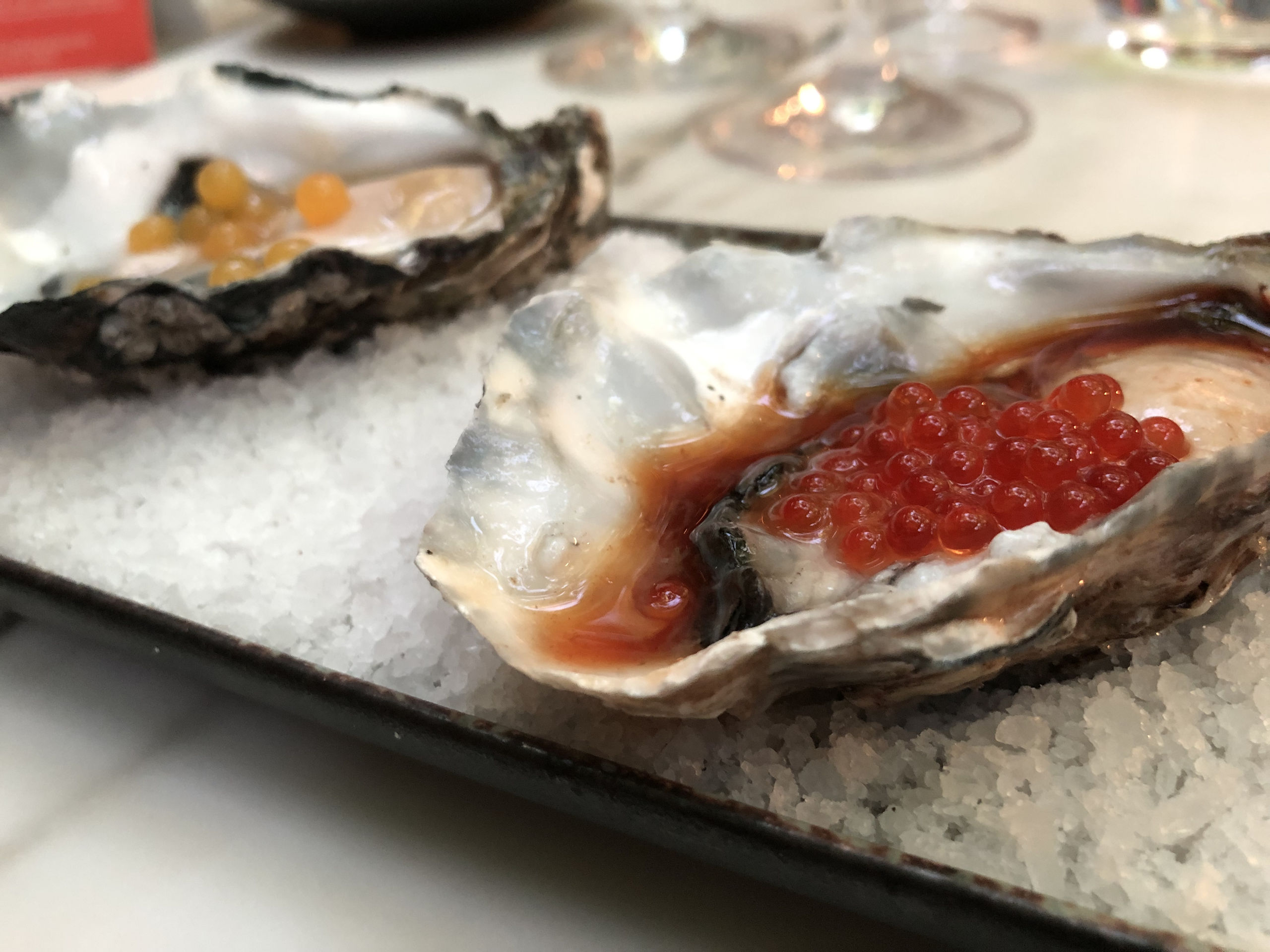El menú arranca con un dúo de ostras: una con perlas de fruta de la pasión y tabasco de jalapeño obra de Sandoval y otra con salsa ponzu y huevas de trucha marinada, de Suárez de Lezo.