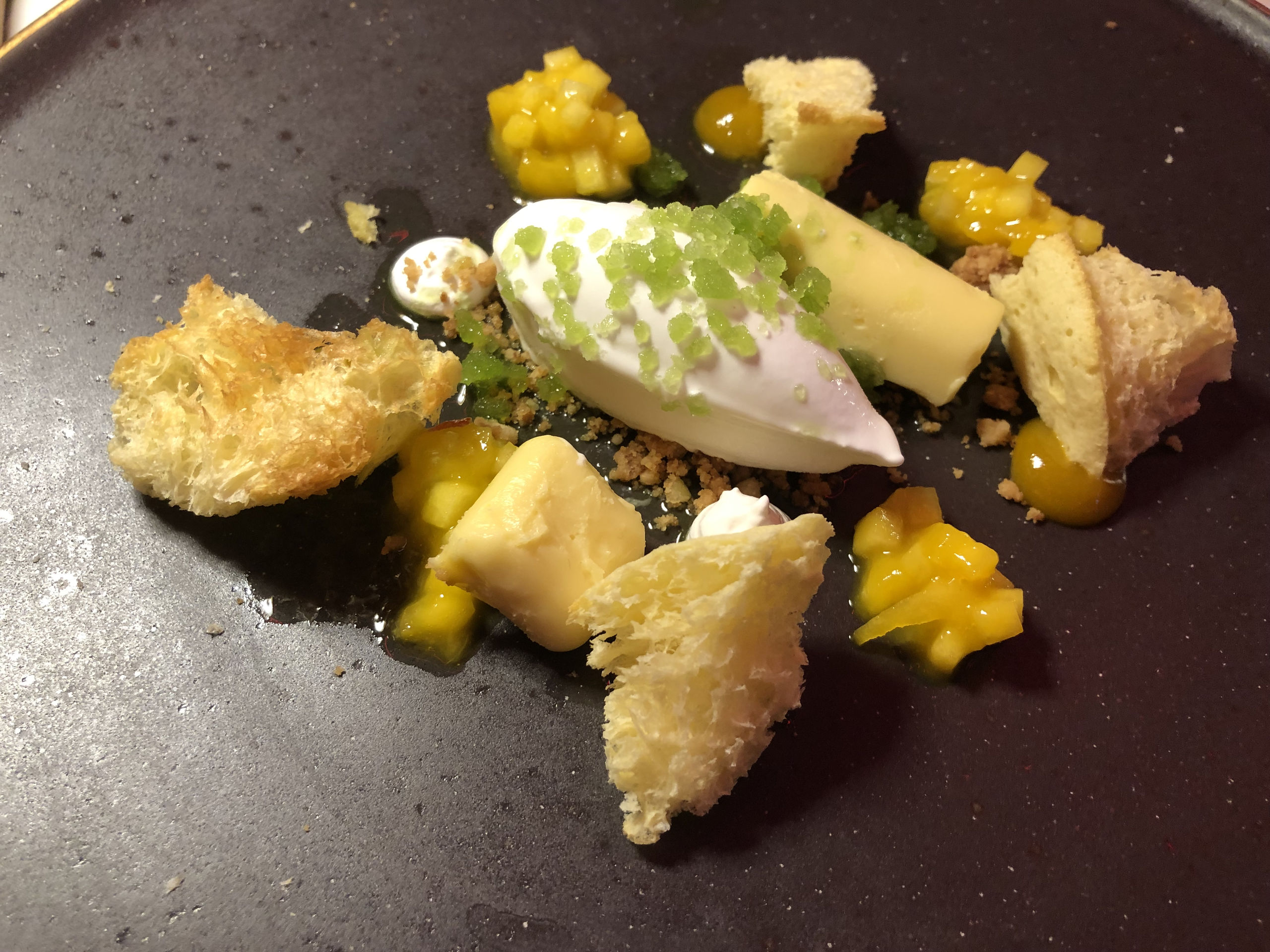 Para terminar este espectacular menú, un cremoso con fruta de la pasión, sorbete de yogur, bizcocho de aceite de oliva y granita de albahaca.