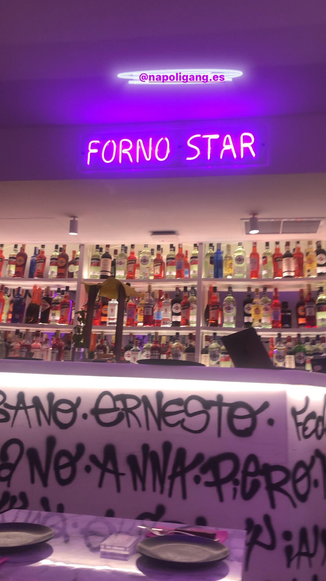 El comedor de Napoli Gang, con mesas para 12 comensales y la decoración a cargo del estudio de diseño interno del grupo, Studio Kiki, y se ha empapado de las vibraciones de los Gangs americanos para plasmarlo en un ambiente desenfadado, divertido y con mucha personalidad en el que destaca la cultura callejera en un espacio lleno de neones y juegos de palabras en modo de grafitis obra de Nicolás Romero @eversiempre.