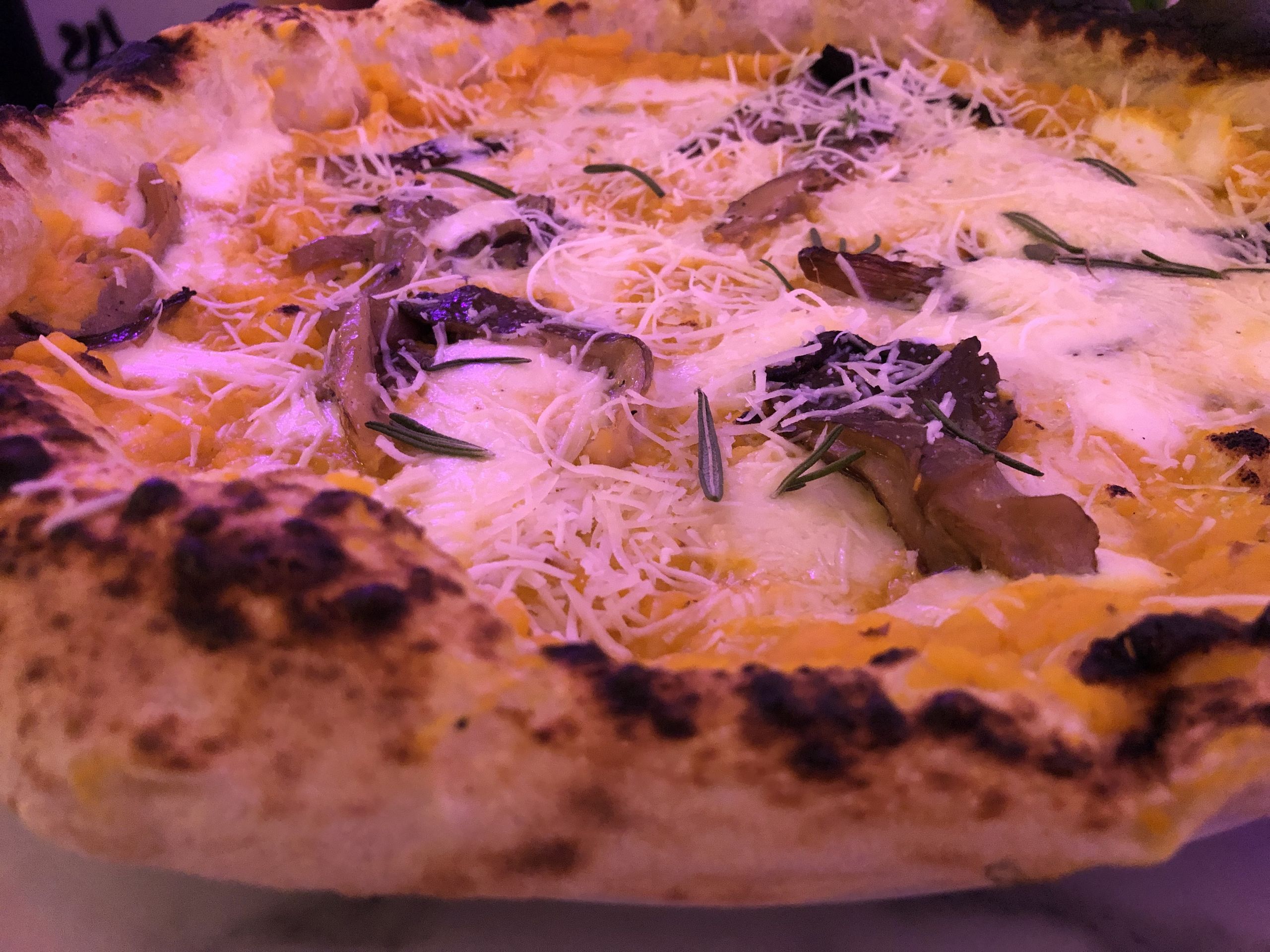 Pizza Calabacheese de Napoli Gang, con crema de calabaza, setas pleurotus, fior di latte, romero y pecorino rallado.