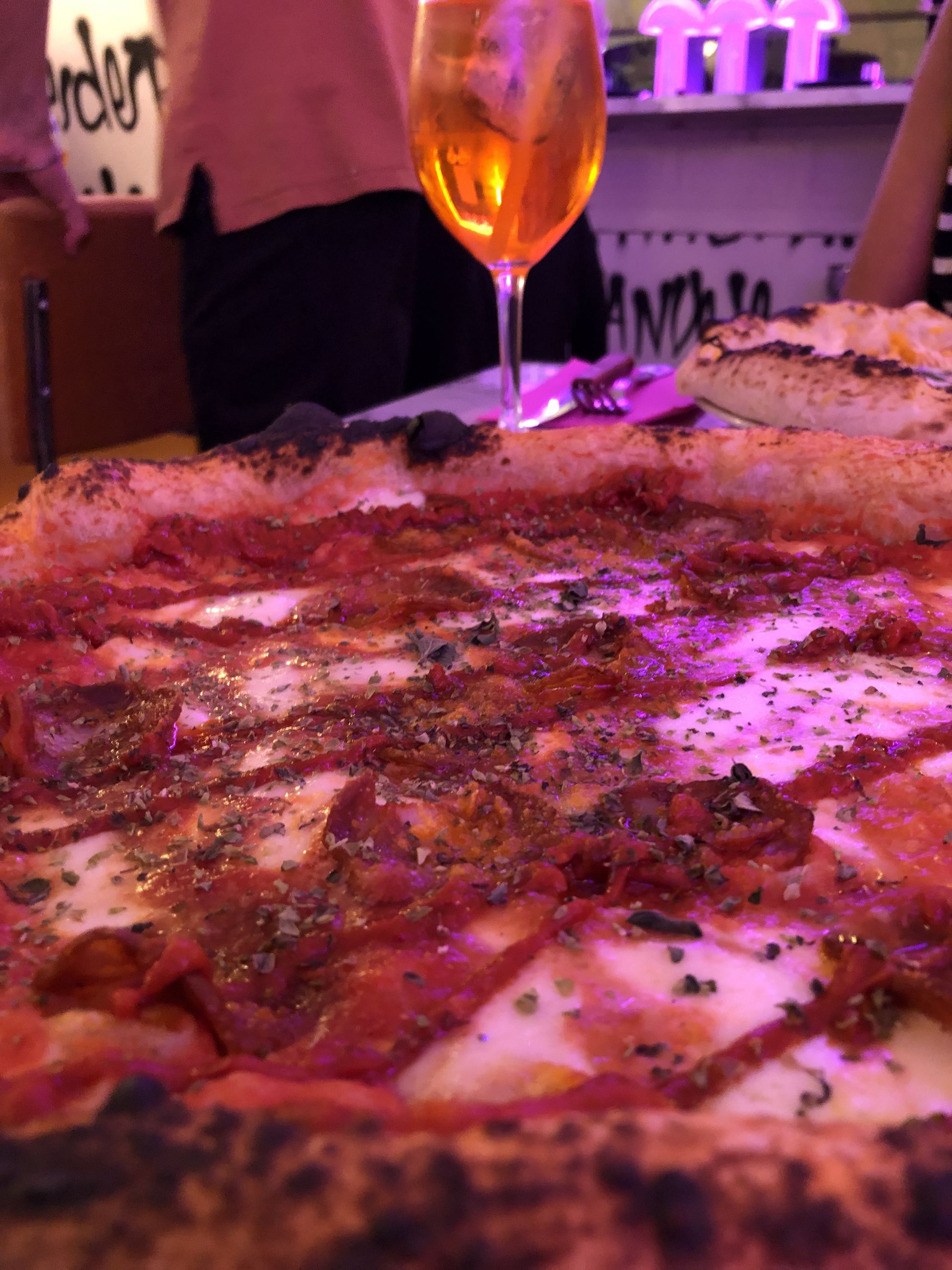 Pizza You turn me on de Napoli Gang, salami picante, salsa picante de nduja, mozzarella fior di latte, salsa de tomate San Marzano, orégano y mejorana fresca, acompañada por un Aperol Spritz.