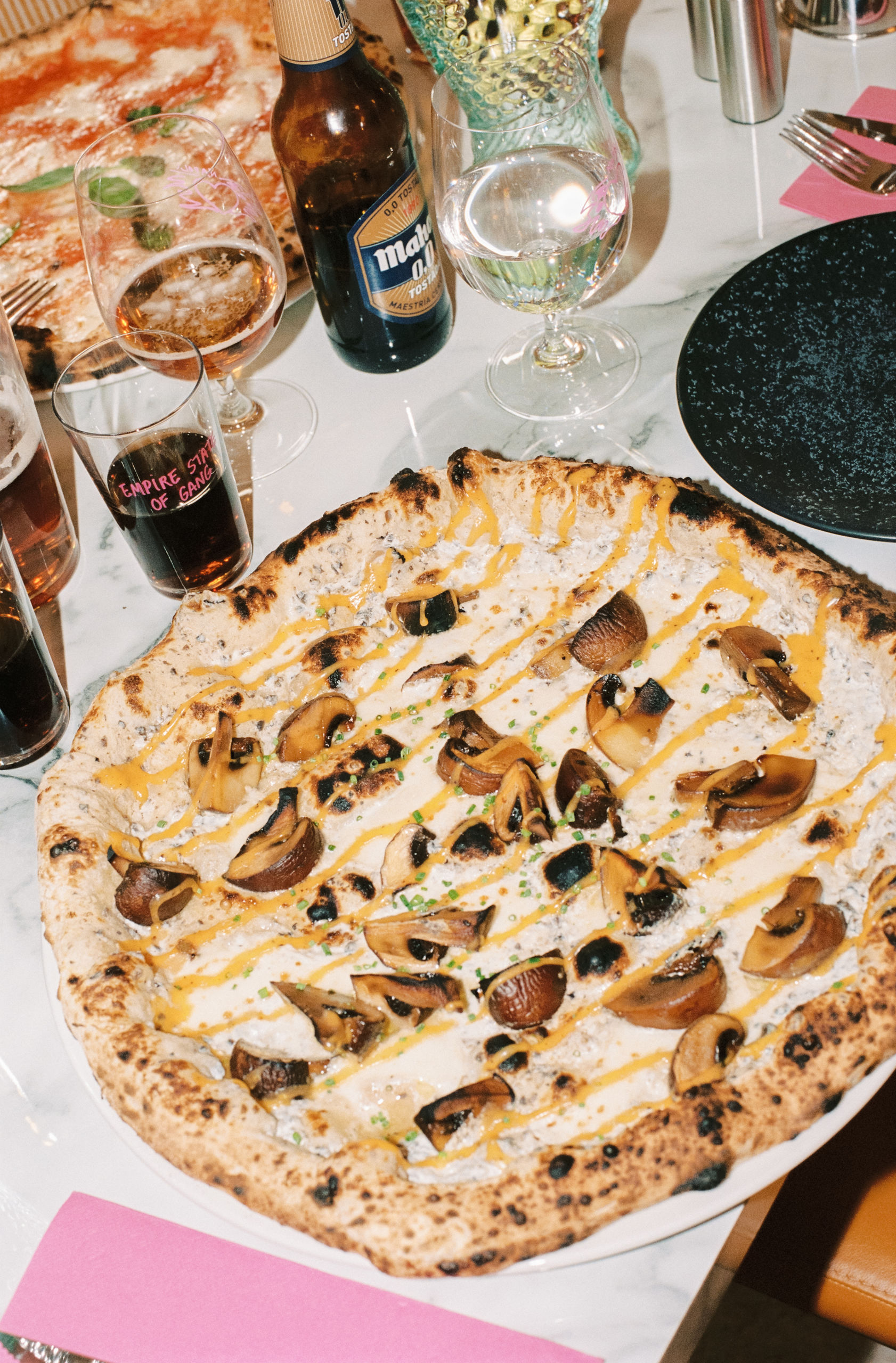 Pizza Truffle Carbogang de Napoli Gang, con champiñones portobello, grana padano, mozzarella fior di latte, salsa de ricotta con trufa, cremosa salsa carbonara y albahaca fresca.