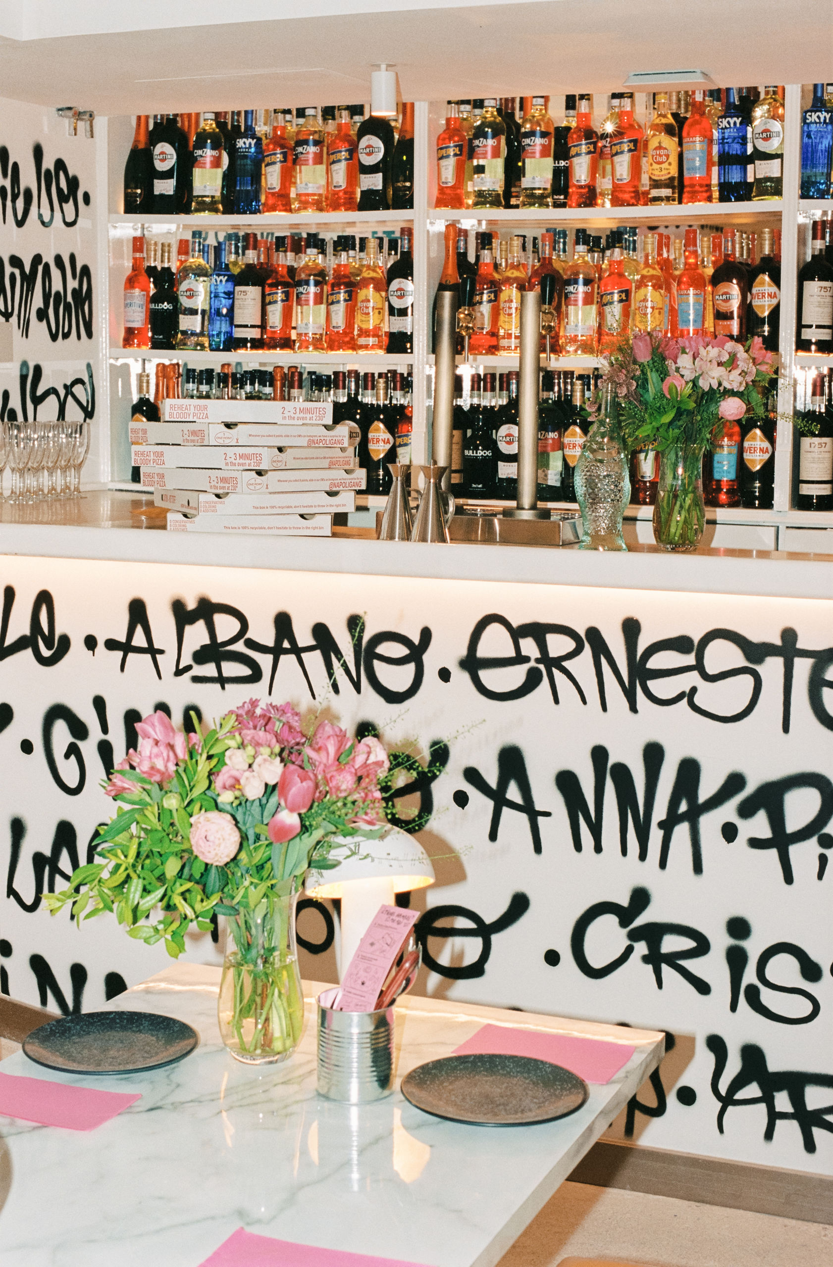 La barra de Napoli Gang con sus grafitis y las botellas para preparar los cócteles.