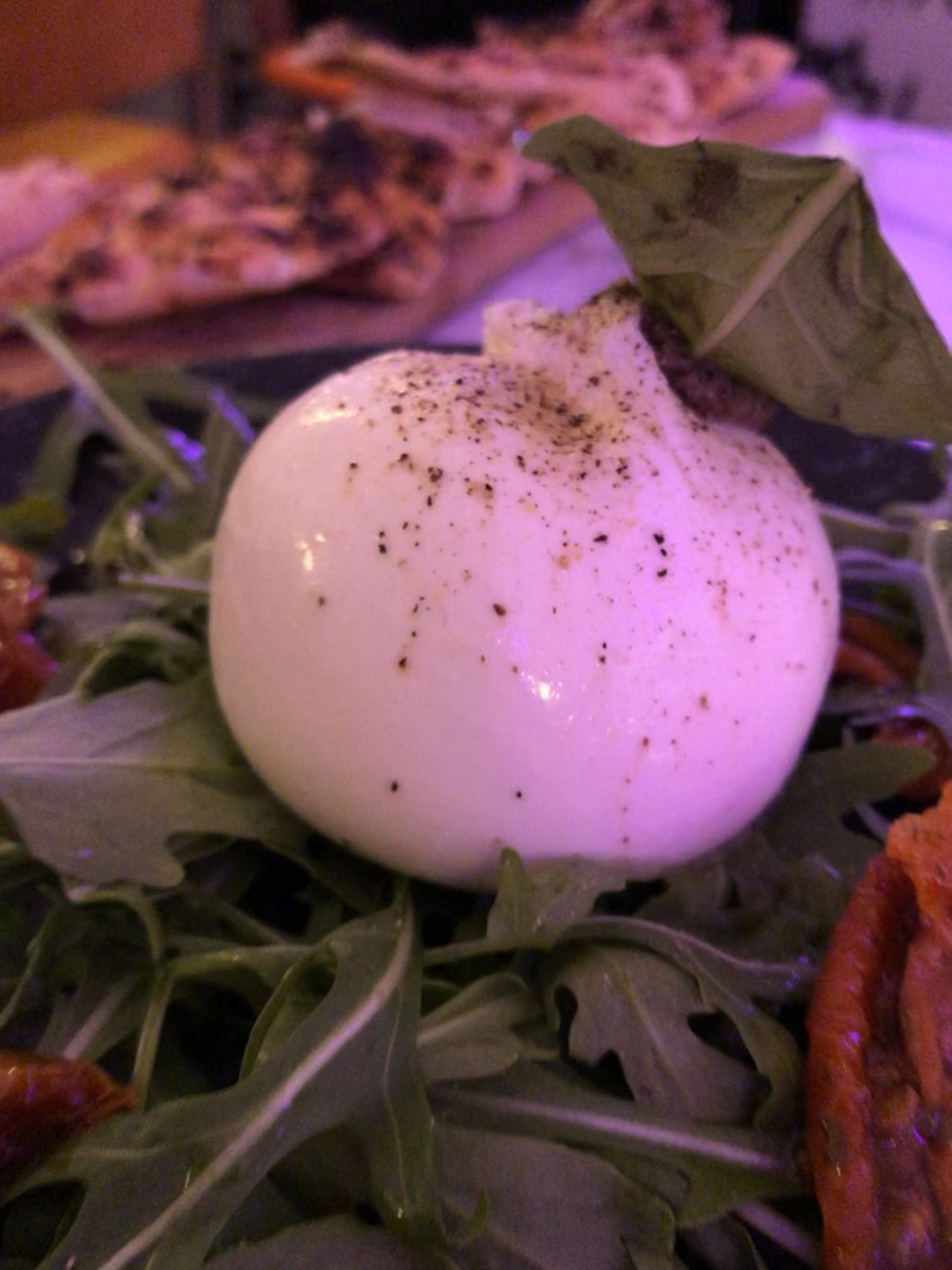 De hecho, como entrante probamos una deliciosa burrata al tartufo (9€), directa de Puglia, rellena con pesto de albahaca y acompañada de rúcula, tomates semiconfitados con ajo, avellanas y albahaca fresca.