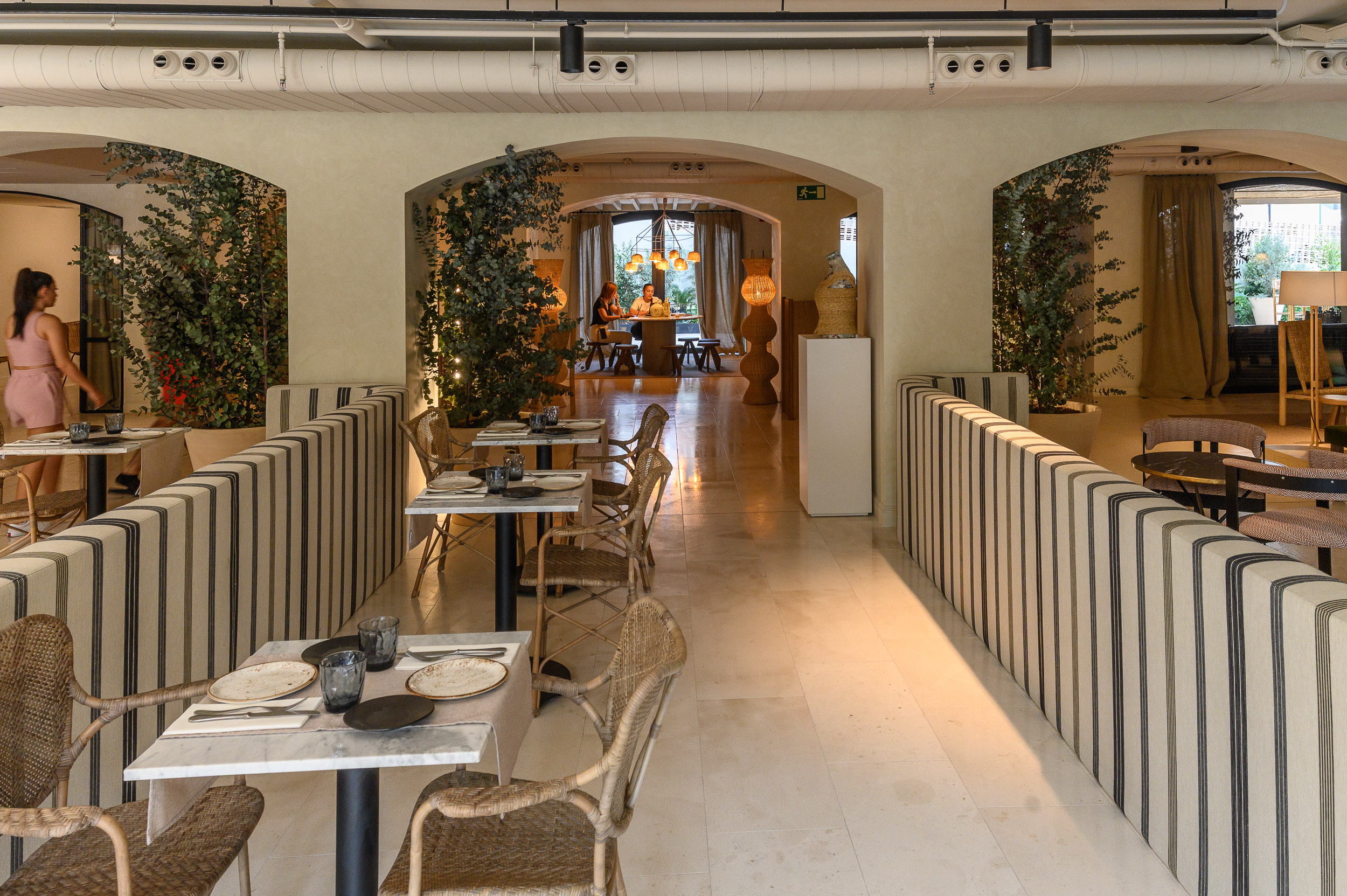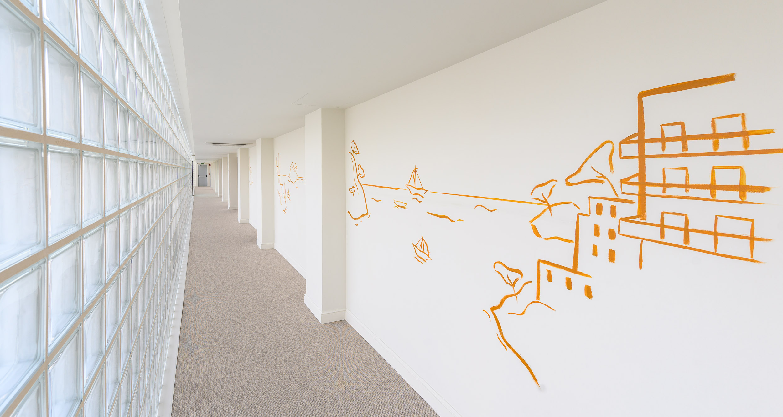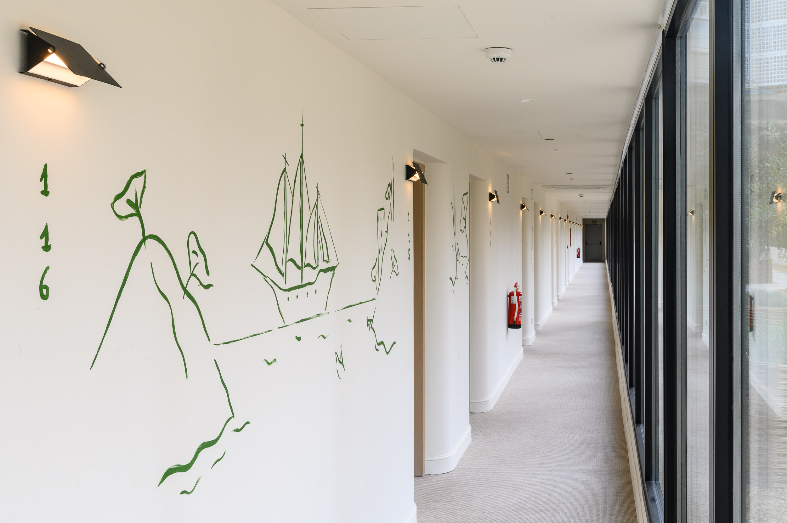 El artista Jorge Parra he decorado los pasillos y ha hecho a mano toda la señalética del hotel, una de las formas de crear el ambiente mediterráneo que buscaba el proyecto.
