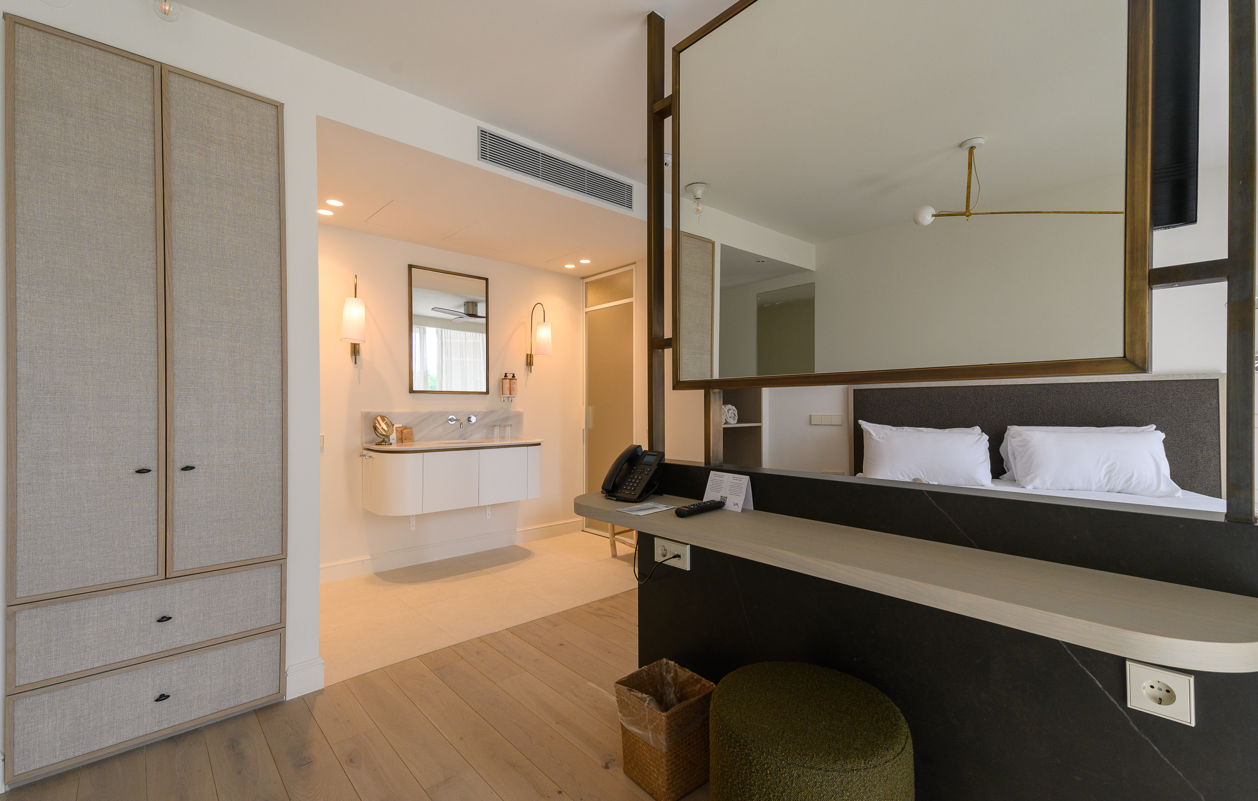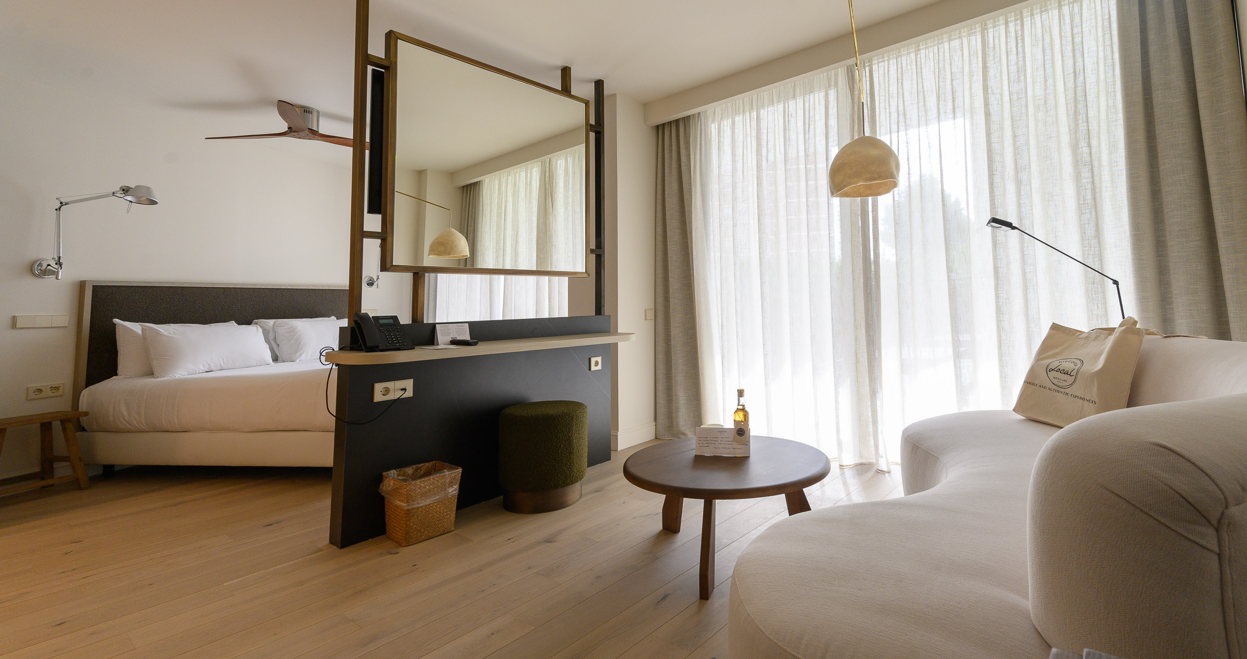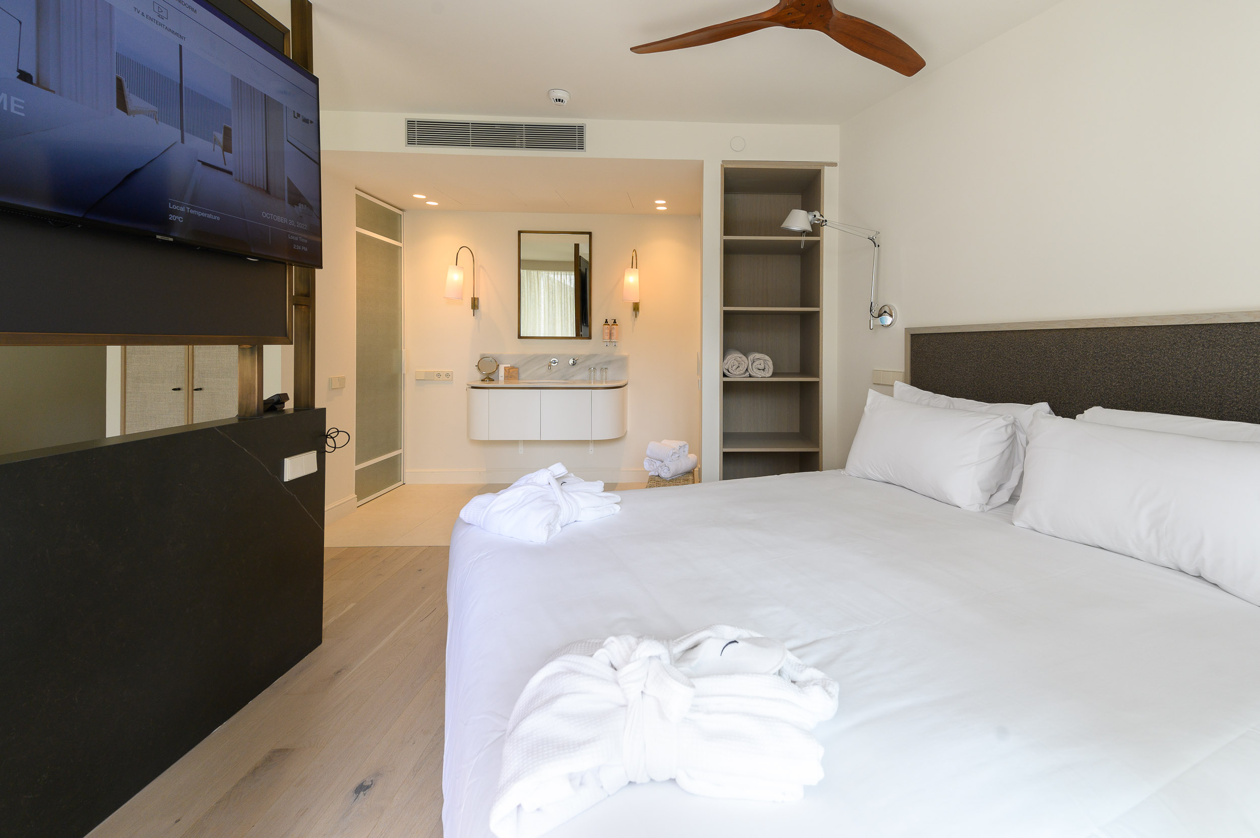 La cama y el cuarto de baño abierto de una de las suites deluxe.