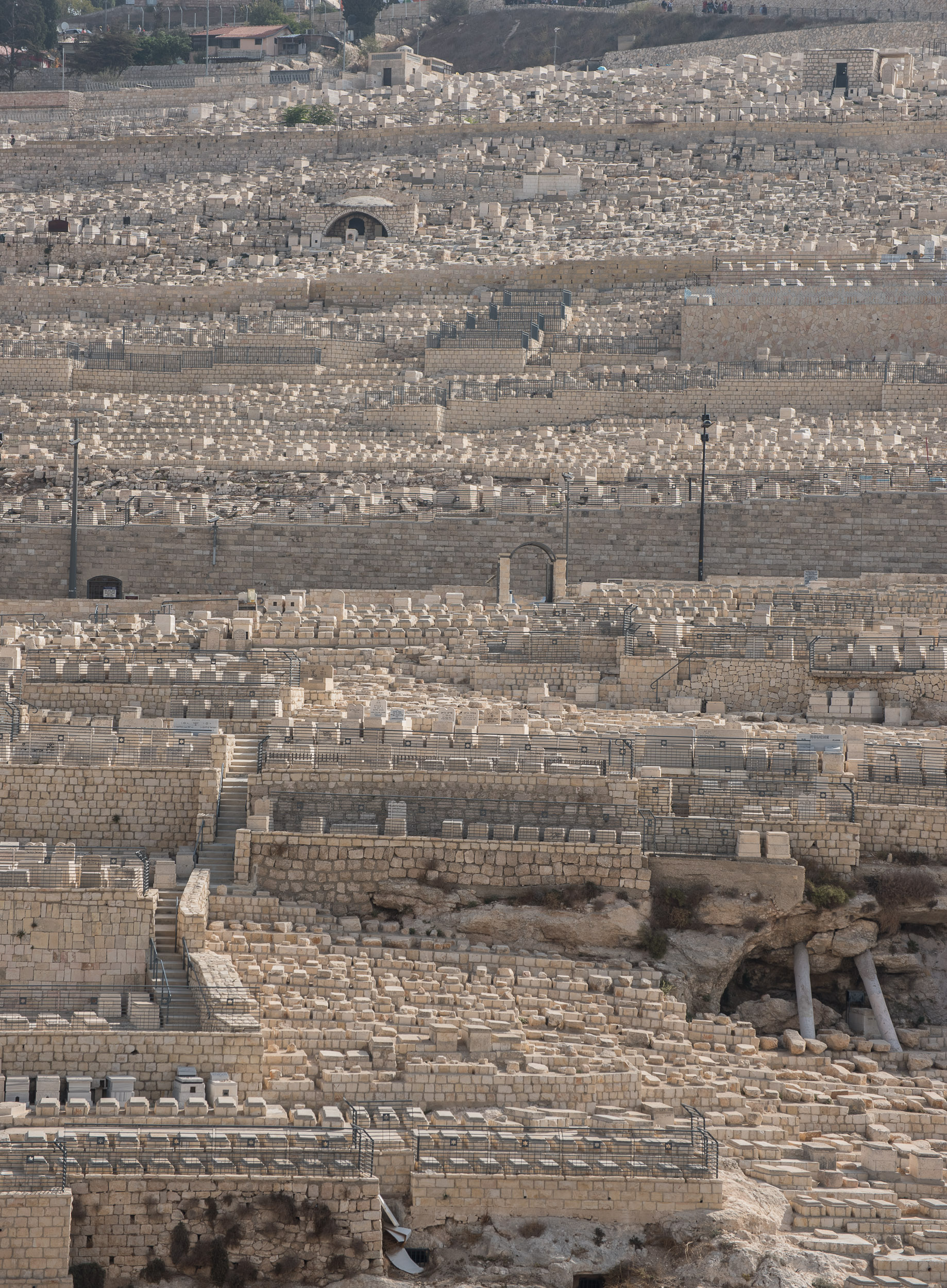 Muy distinto al cementerio viejo de Praga, el del Monte de los Olivos en Jerusalén es también espectacular y, además, tiene singular importancia para judíos de todo el mundo, no sólo porque a sus pies están las tumbas de varios patriarcas sino porque muchos creen que los enterrados allí serán los primeros en resucitar. Cientos de miles de tumbas dan fe de esa creencia.