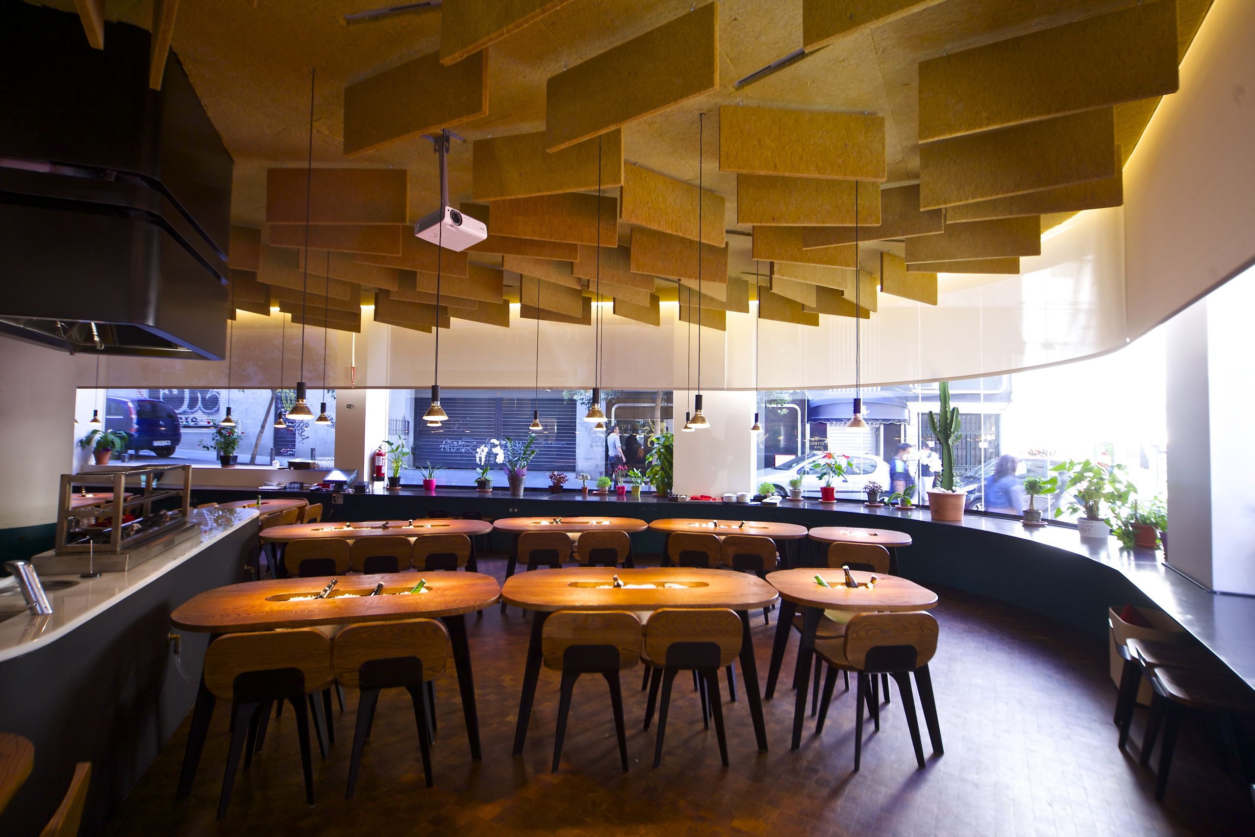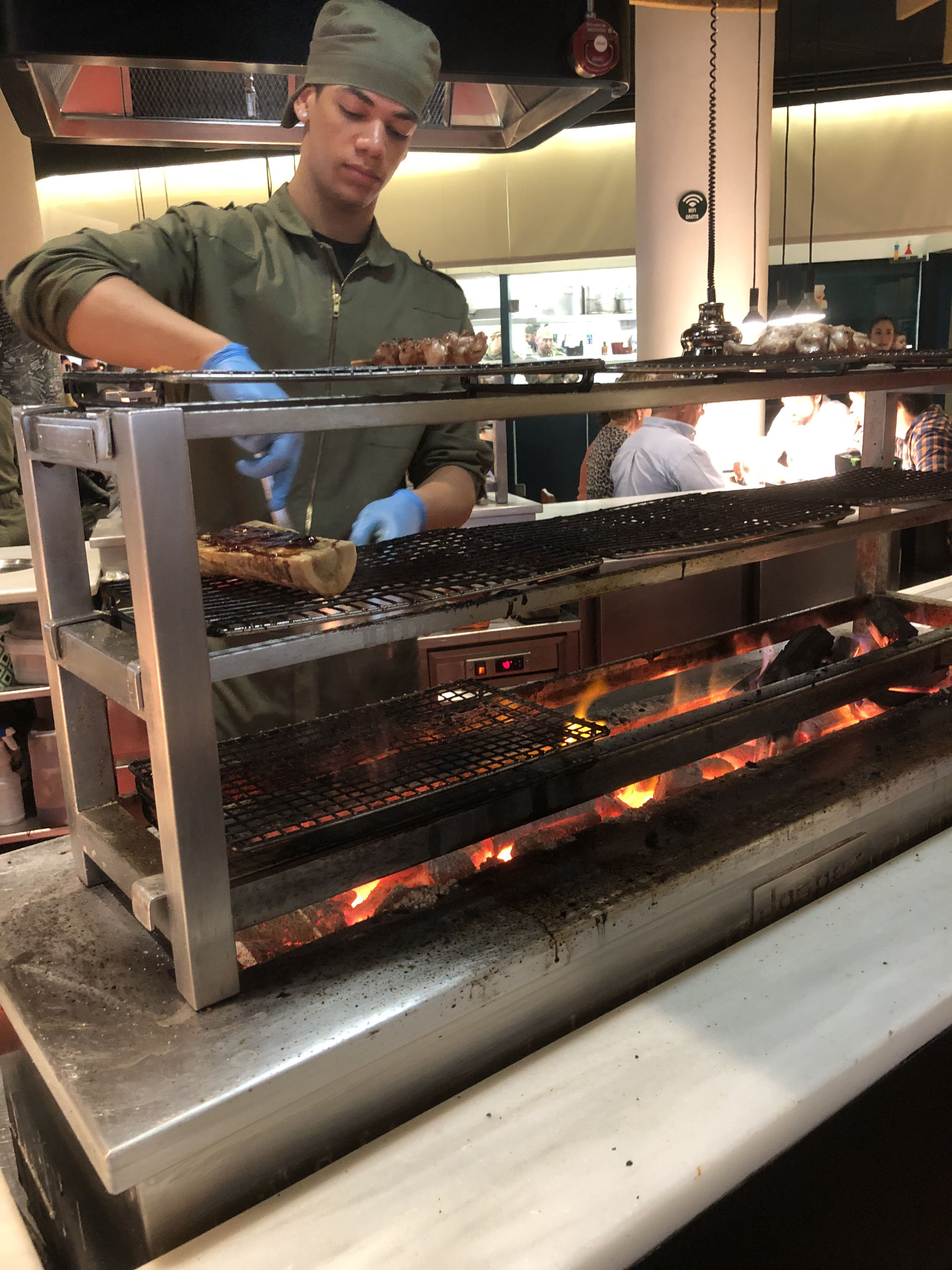 Aunque los locales suelen estar llenos de gente, la acústica es perfecta y no hay que alzar la voz para hablar con tus acompañantes. Además, la cocina está a la vista y las parrillas forman parte del centro del local. Una estupenda inversión hace que no notes ni el calor de la brasas ni el humo que se desprende. Sólo notas su sabor en los platos.