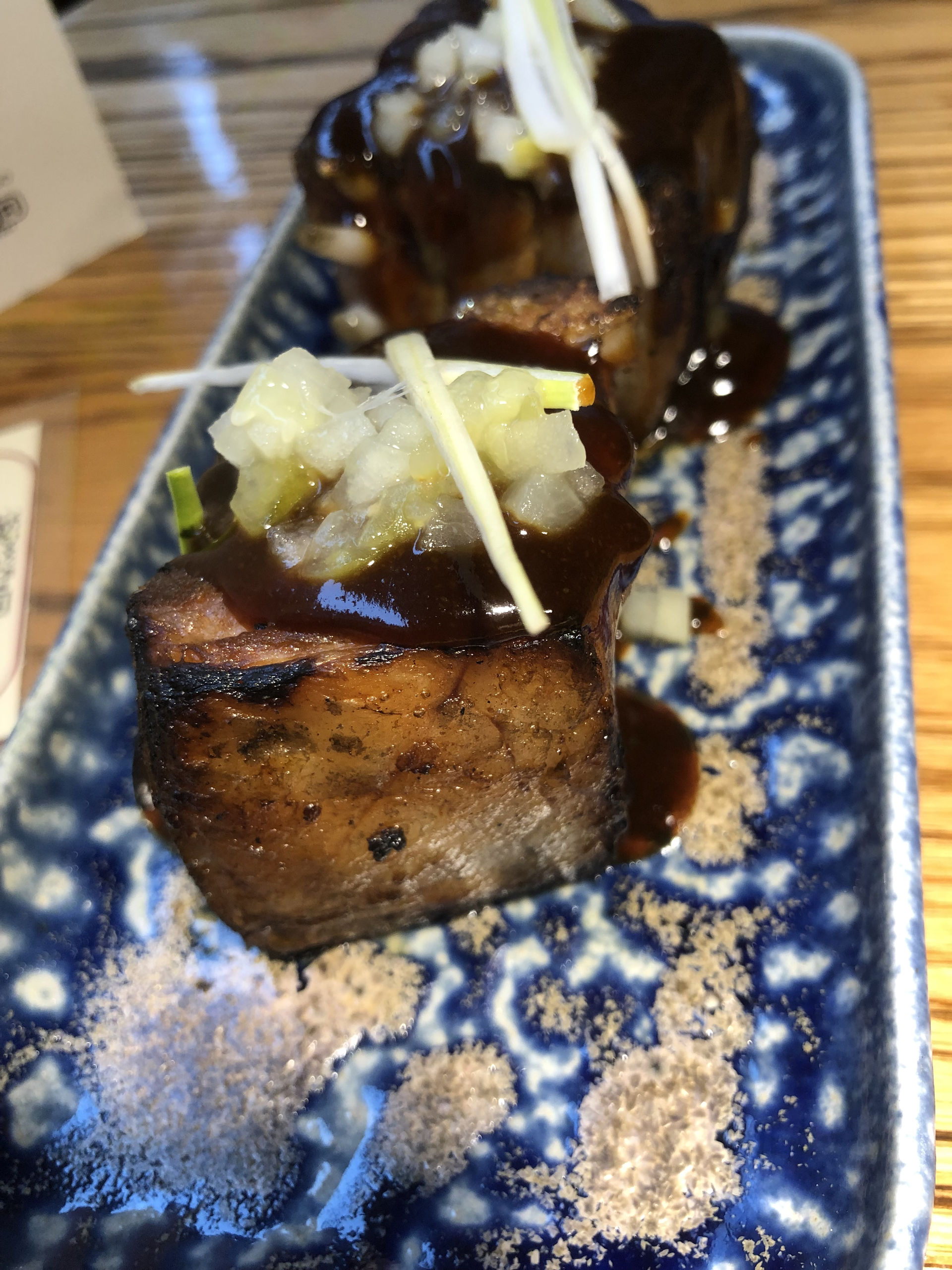 Como decíamos, las brasas son las grandes protagonistas de este restaurante y en la carta te viene perfectamente especificado cada plato que está pasado por la robata. Nosotros comenzamos con su versión de la gilda de bonito a la brasa (2 uds 6,50€), con un producto de primera calidad y el toque perfecto para darle ese sabor tan característico. Buenas también las gyozas de ternera (6 uds 11,30€). Éstas y la berenjena en tempura con salsa satay y lima (6,90€) son de los pocos platos que no pasan por la parrilla pero que también merecen la pena probar.