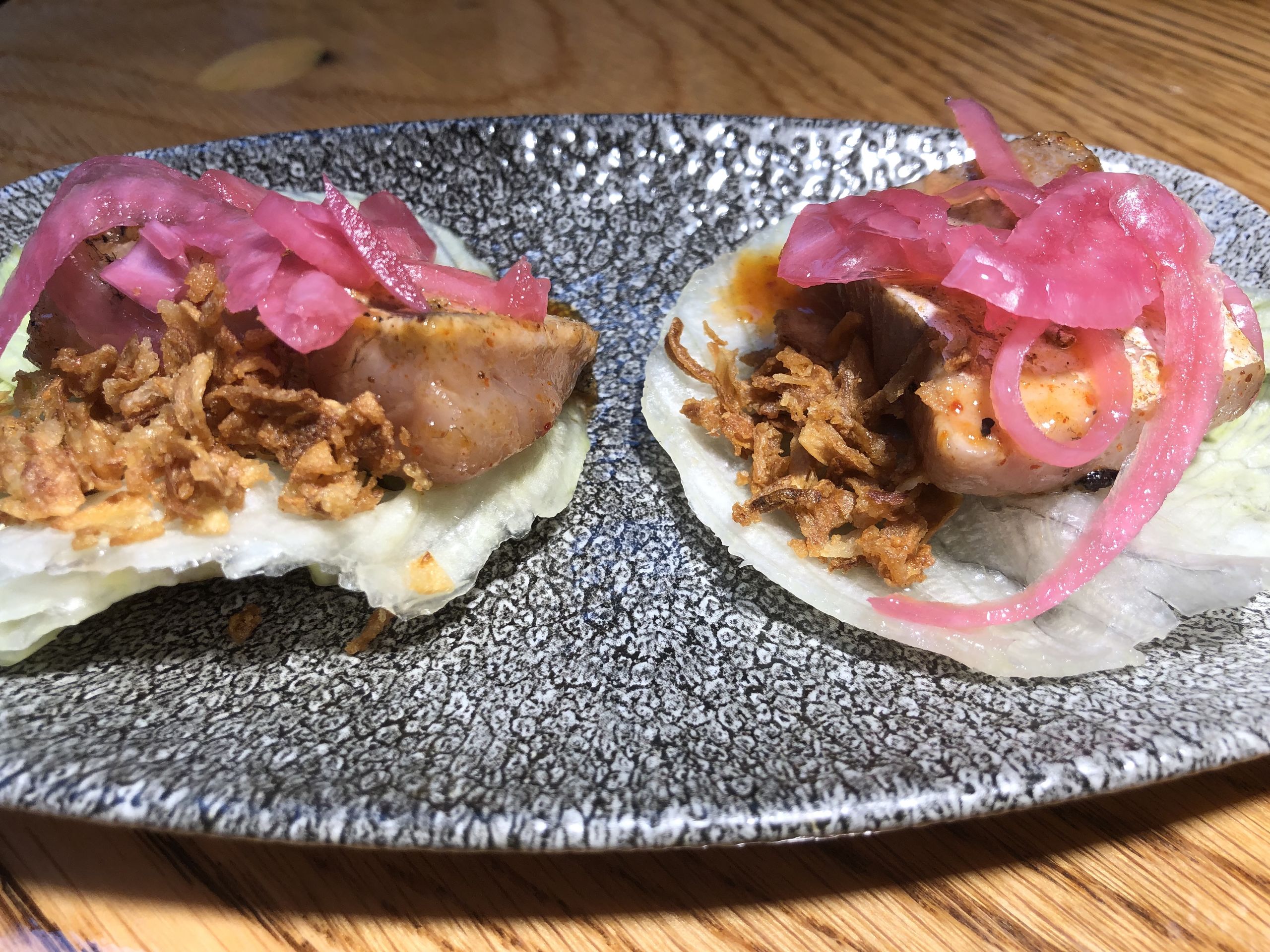 El chef se ha traído a Madrid de sus innumerables viajes los mejores ingredientes de cada país para dar su visión más personal de una cocina fusión que se aprecia en cada receta. Continuamos con una exquisita panceta de cerdo a la parrilla con salsa japonesa (2 uds 8,50€), perfectamente desgrasada y cocinada para que disfrutes de uno de los mejores platos de la carta. Tanto como el säam de pez limón con kimchi dulce (2 uds 7,80€), perfecto el pescado con el ligero picante de la salsa coreana y el sabor, una vez más, que le proporciona la robata.