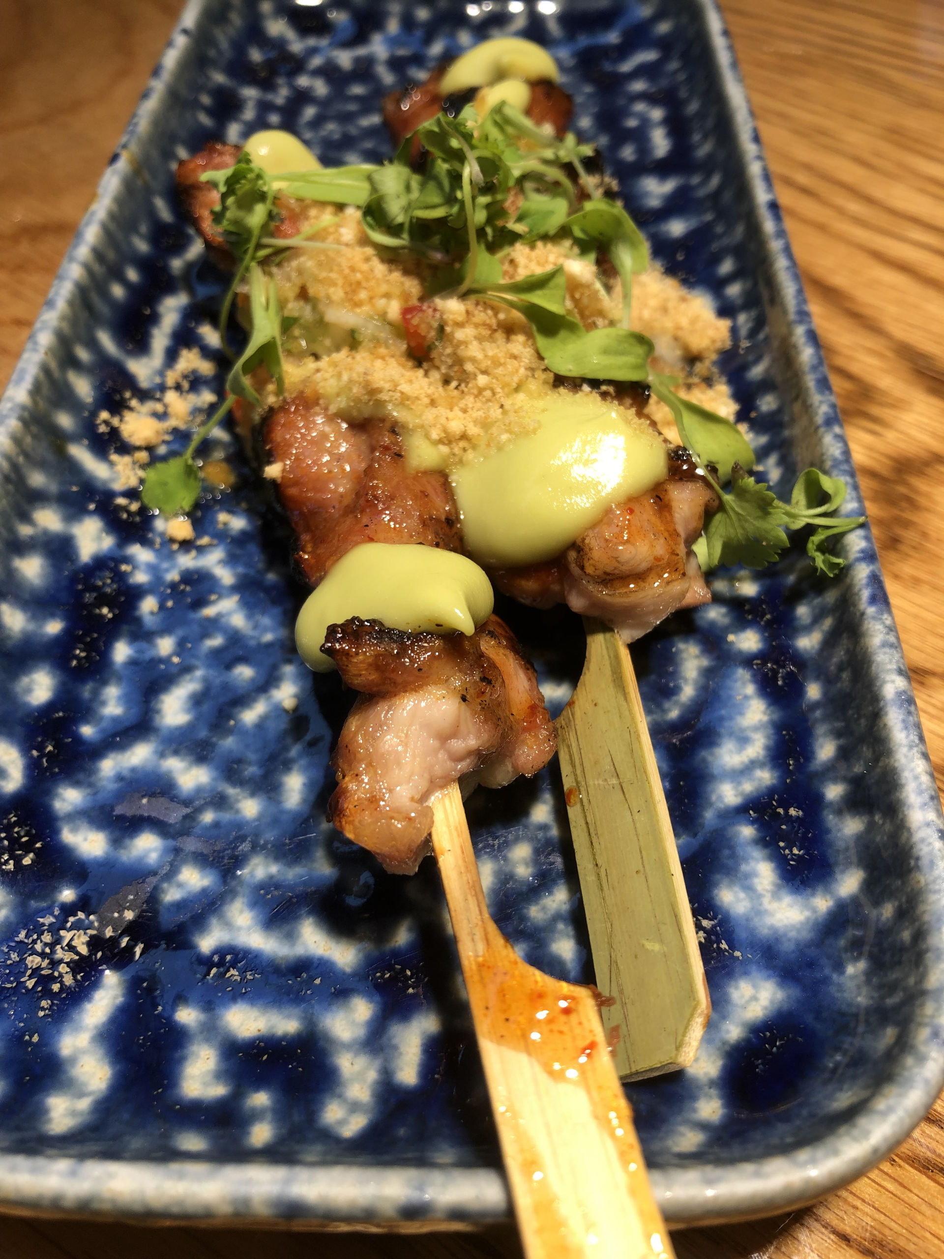 Toda la carta está pensada para compartir de ahí que los platos sean mínimo para dos personas, así que seguimos disfrutando con un delicioso yakitori de pollo con kimchi y guacamole ácido (2 uds 6,60€). Puedes acompañar tu menú con unos maravillosos dados de boniatio al carbón templado y aliñado (6,40€).