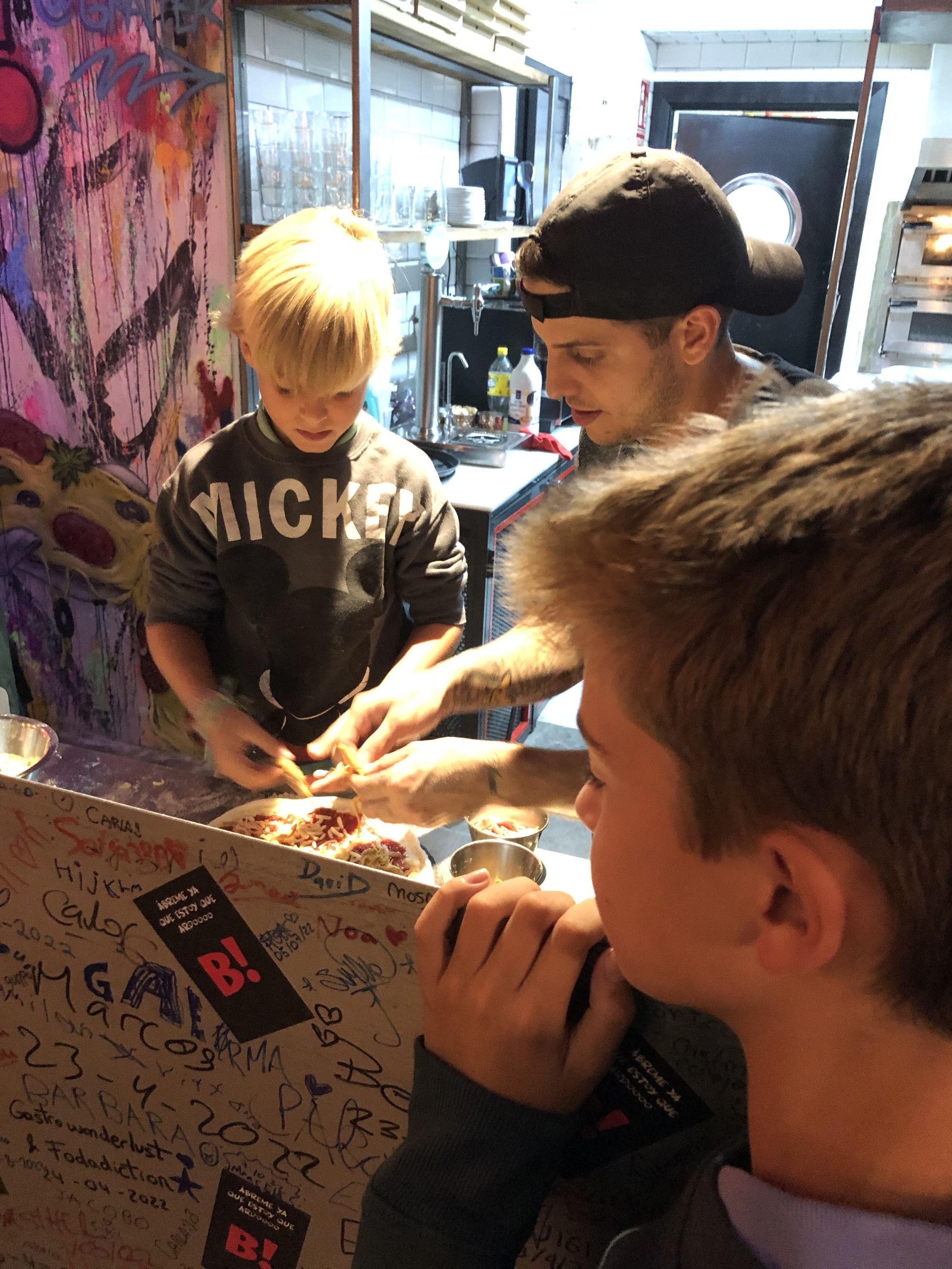 Efectivamente, los auténticos protagonistas de esta experiencia diferente de ocio y gastronómica son los más pequeños. En el carrito elegirás los ingredientes que más te apetezcan añadir a tu pizza y con las indicaciones del pizzaiolo estirarás la masa para que quede perfecta. A continuación le añadirás el tomate, el queso y los ingredientes seleccionados.
