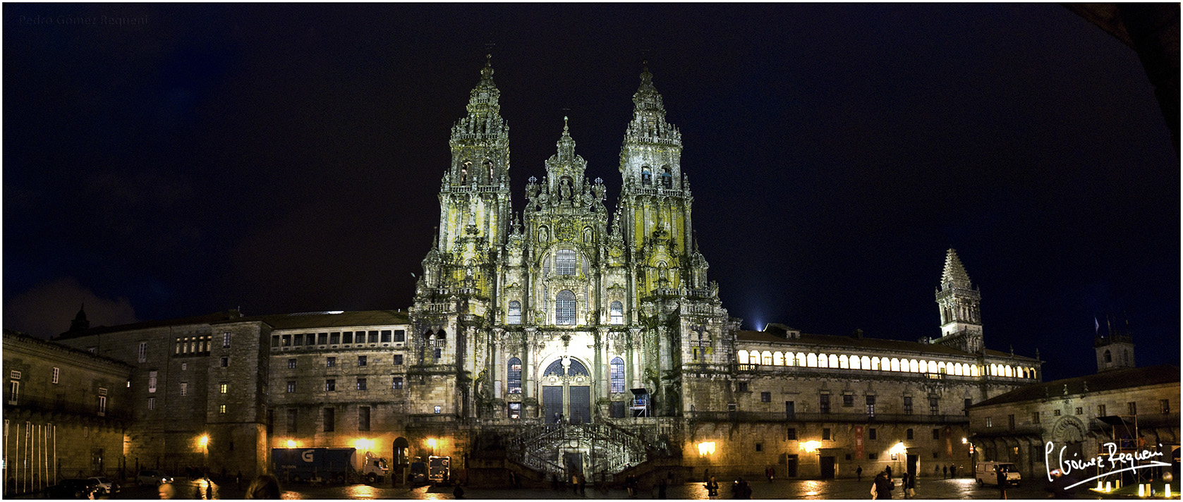 La Plaza del Obradoiro es el centro monumental de Santiago de Compostela y una de las plazas más representativas de toda España. Su nombre gallego parece derivarse de los talleres de canteros que trabajaron en la construcción de la fachada barroca de la Catedral, que domina la plaza y da la bienvenida a los miles de peregrinos que llegan por el Camino de Santiago. Los edificios que cierran la plaza –la Catedral, el Hostal de los Reyes Católicos, hoy parador nacional y antes hospital de peregrinos; el Colegio de San Xerome, sede del rectorado de la universidad, y el Palacio de Raxoi, sede d el Ayuntamiento de Santiago– son representación de los principales polos de la vida de la capital gallega: la religión, la educación universitaria, la atención al peregrino y al viajero, y la Administración. Esta plaza tiene la cualidad de resumir los usos y la historia milenaria de la ciudad. Un giro de 360 grados permite reconocer a simple vista la presencia de distintos estilos arquitectónicos, surgidos en más de 700 años de construcción.