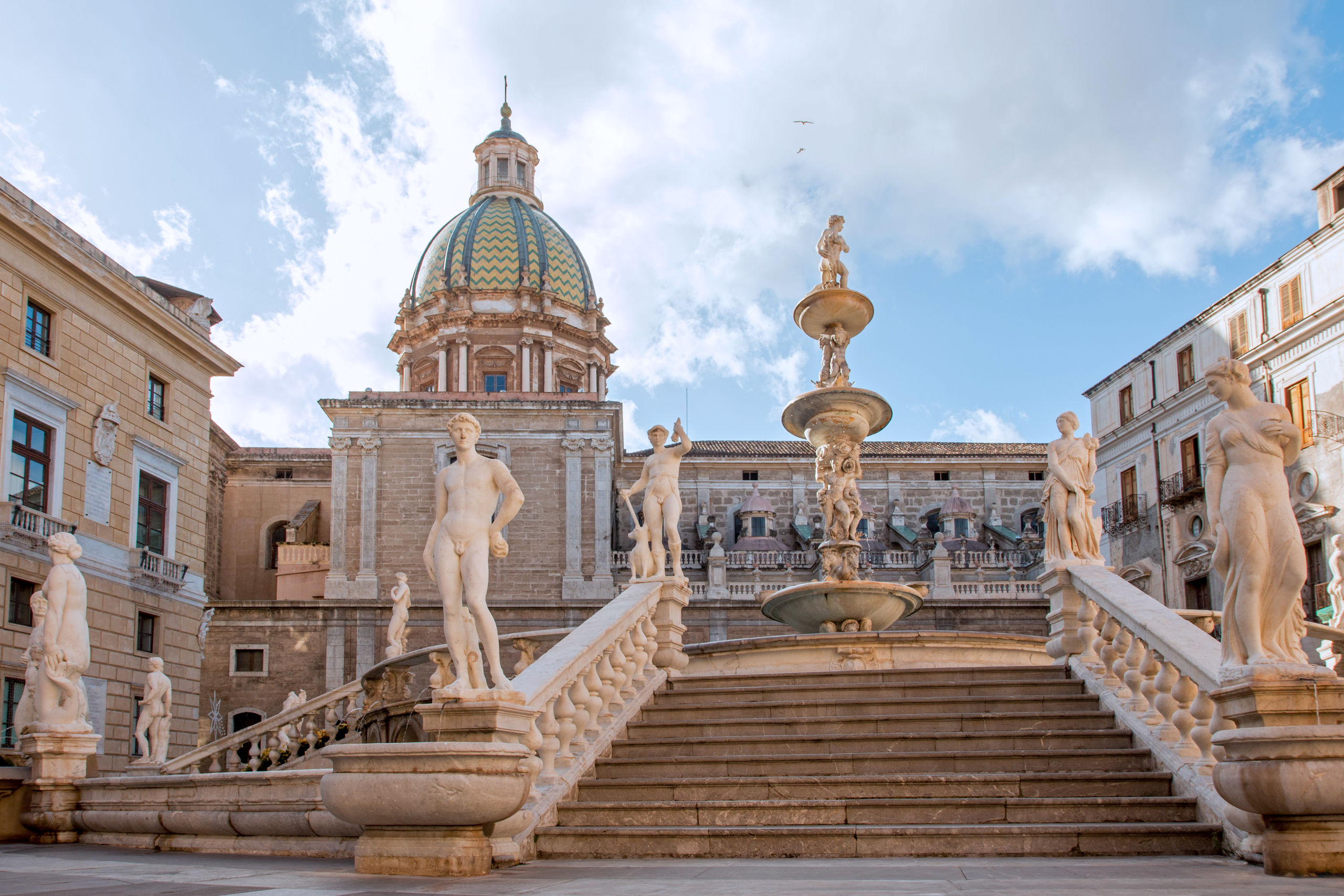La Fontana Pretoria, con la plaza del mismo nombre en la que se encuentra, es uno de los lugares más fotografiado de la capital siciliana. Se trata de una fuente renacentista en principio destinada al jardín privado de una mansión señorial de Florencia. Su escenario representa el mundo mitológico de la antigüedad, con dioses, ninfas y nereidas mostrando sus cuerpos desnudos. La fuente de gran tamaño, ocupa el centro de la Piazza Pretoria y se eleva hasta unos trece metros sobre el nivel de la plaza. Una curiosidad es que se puede acceder al interior de la fuente desde la escalera sur, situada frente al Palazzo delle Aquile. La fuente ha sido realizada enteramente en mármol blanco de Carrara y se desarrolla en dos niveles sobre una planta elíptica y en cada esquina hay una pila presididas por divinidades paganas acostadas. Detrás está la iglesia conventual de Santa Caterina d'Alessandria desde cuyas ventanas enrejadas las monjas de clausura podían ver las estatuas de la fuente, lo que en su época escandalizó a la ciudadanía.