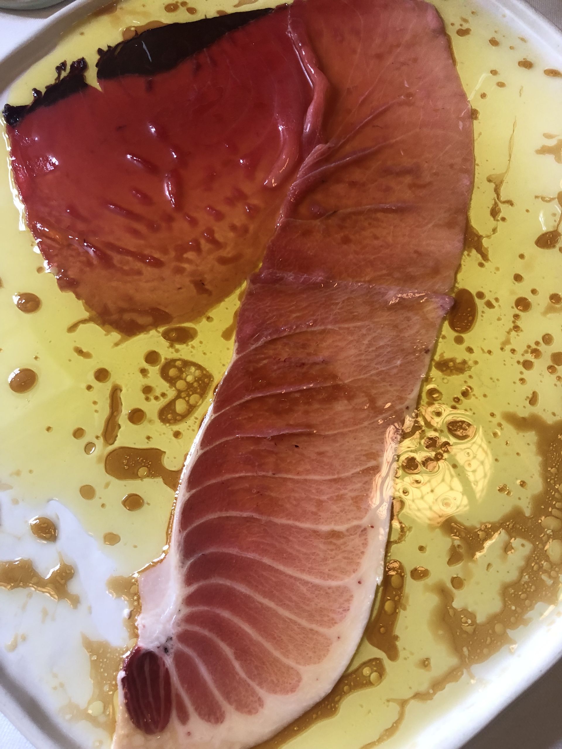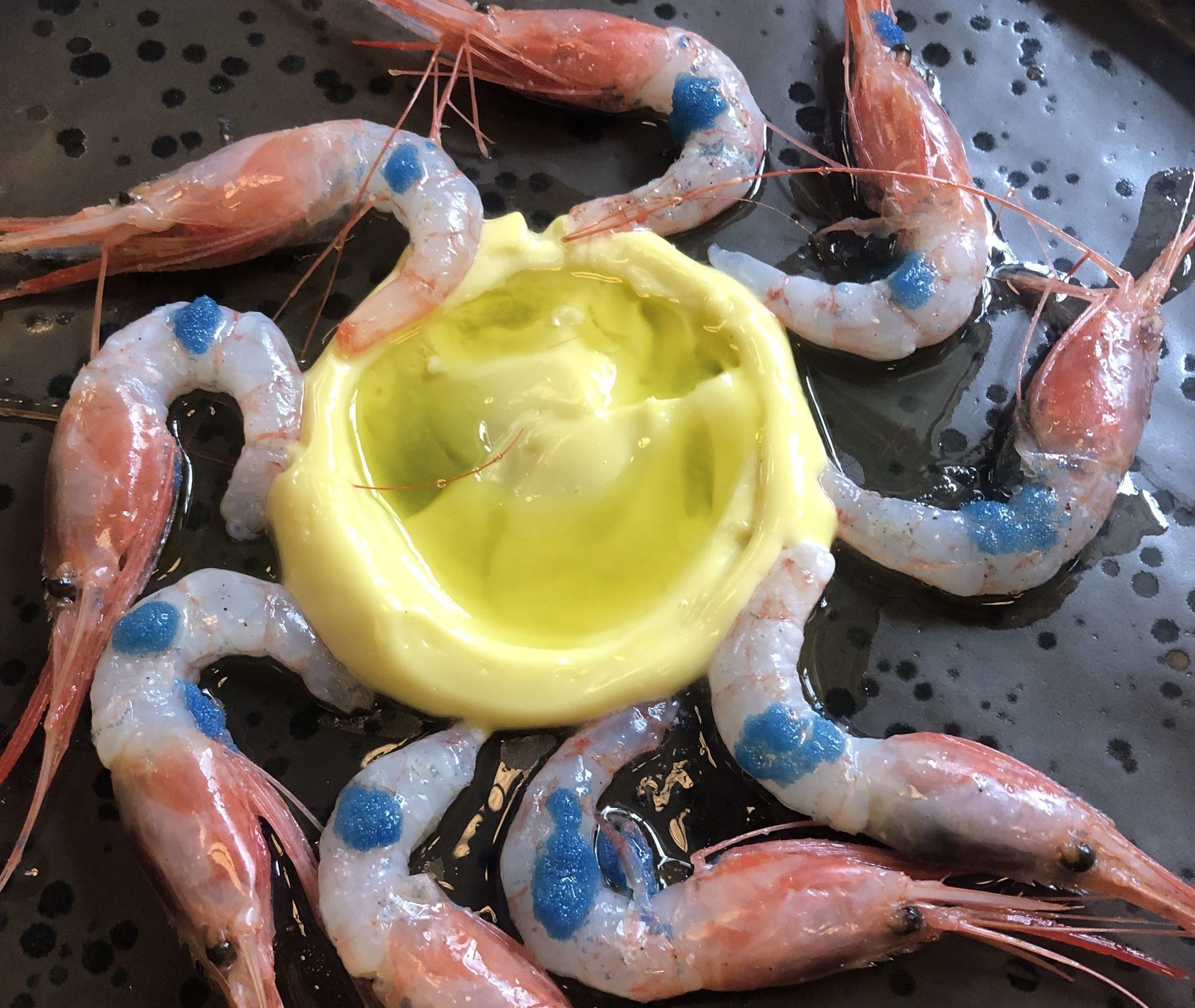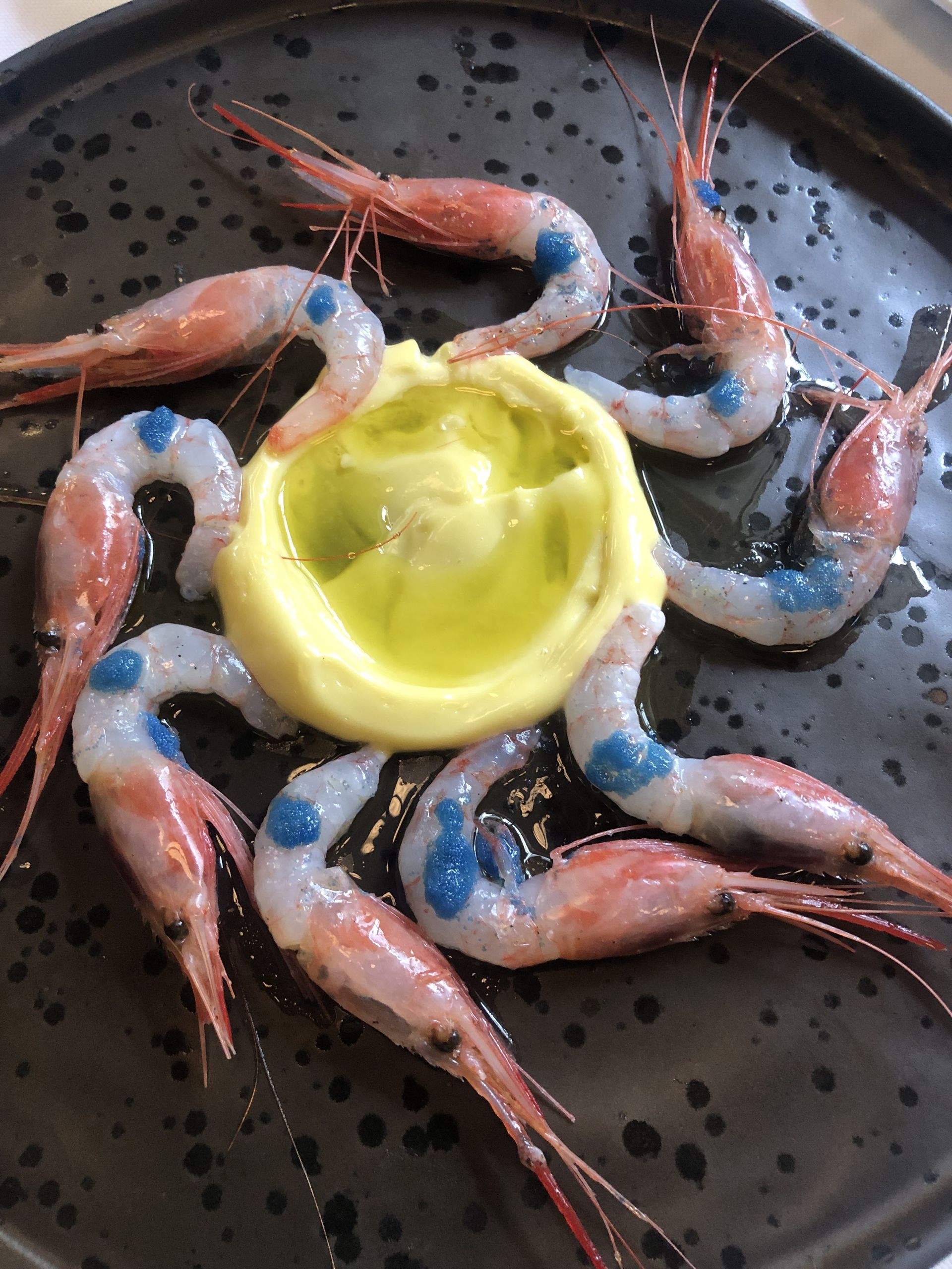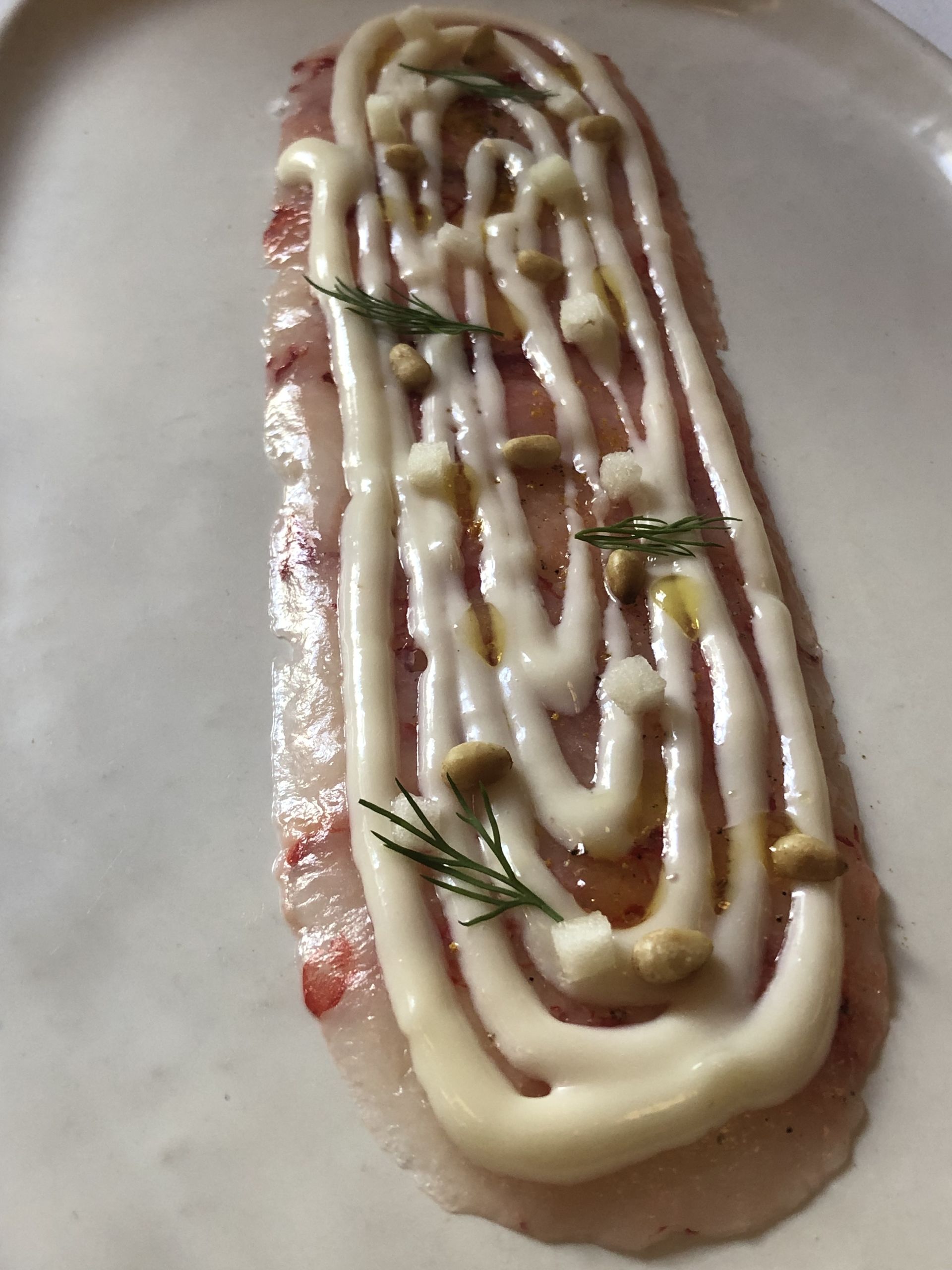 Carrpaccio de carabineros con queso Payoyo, acompañado con piñones, manzana y un ligero toque de mostaza y miel.