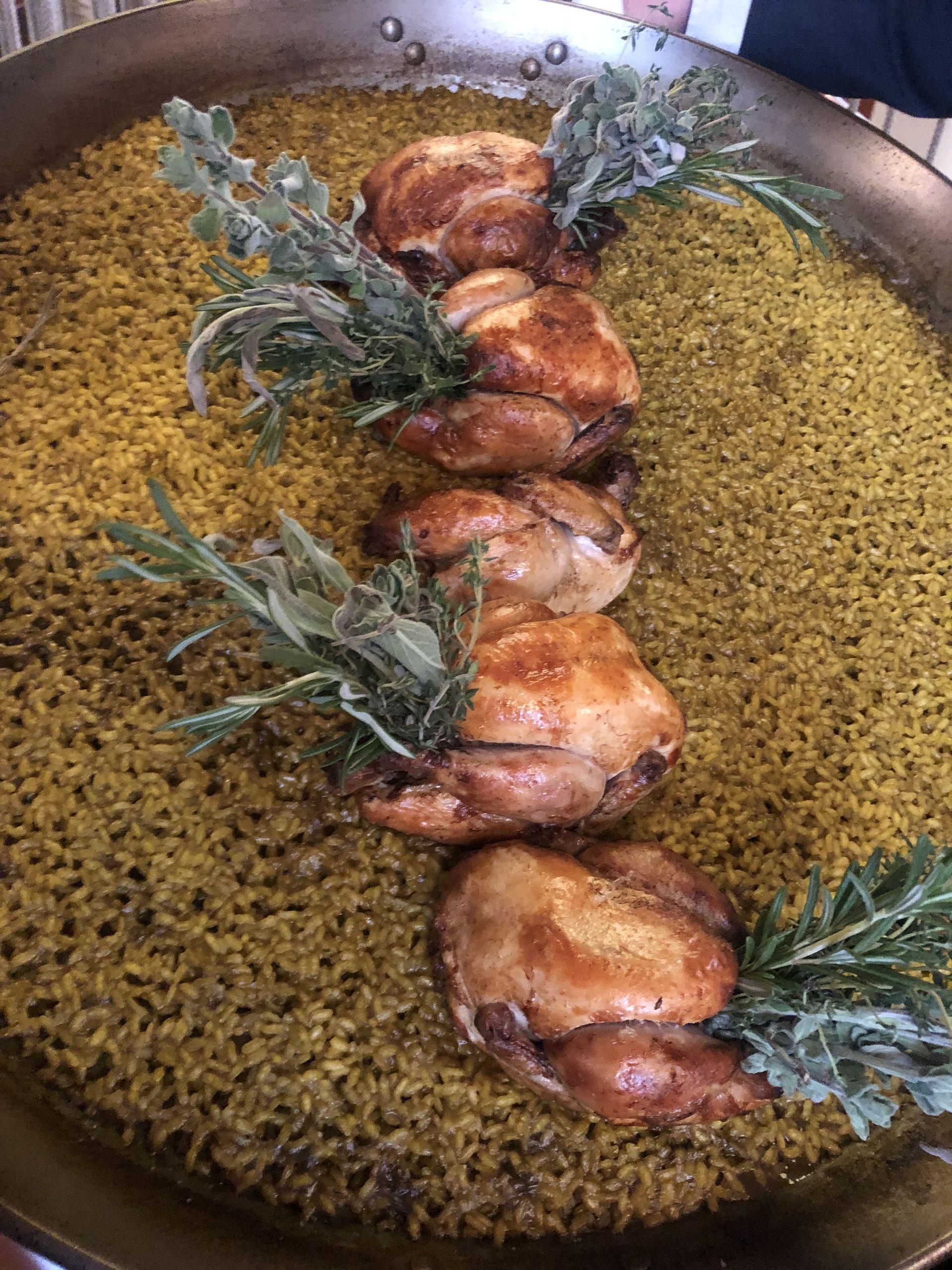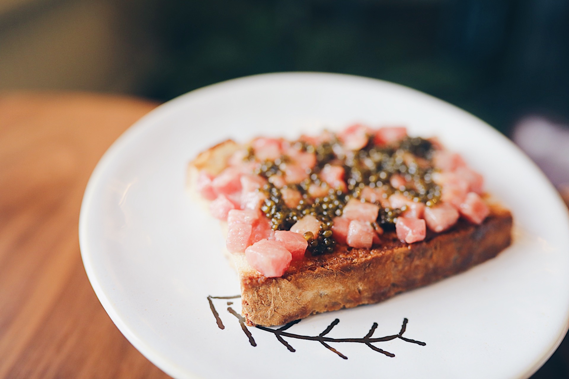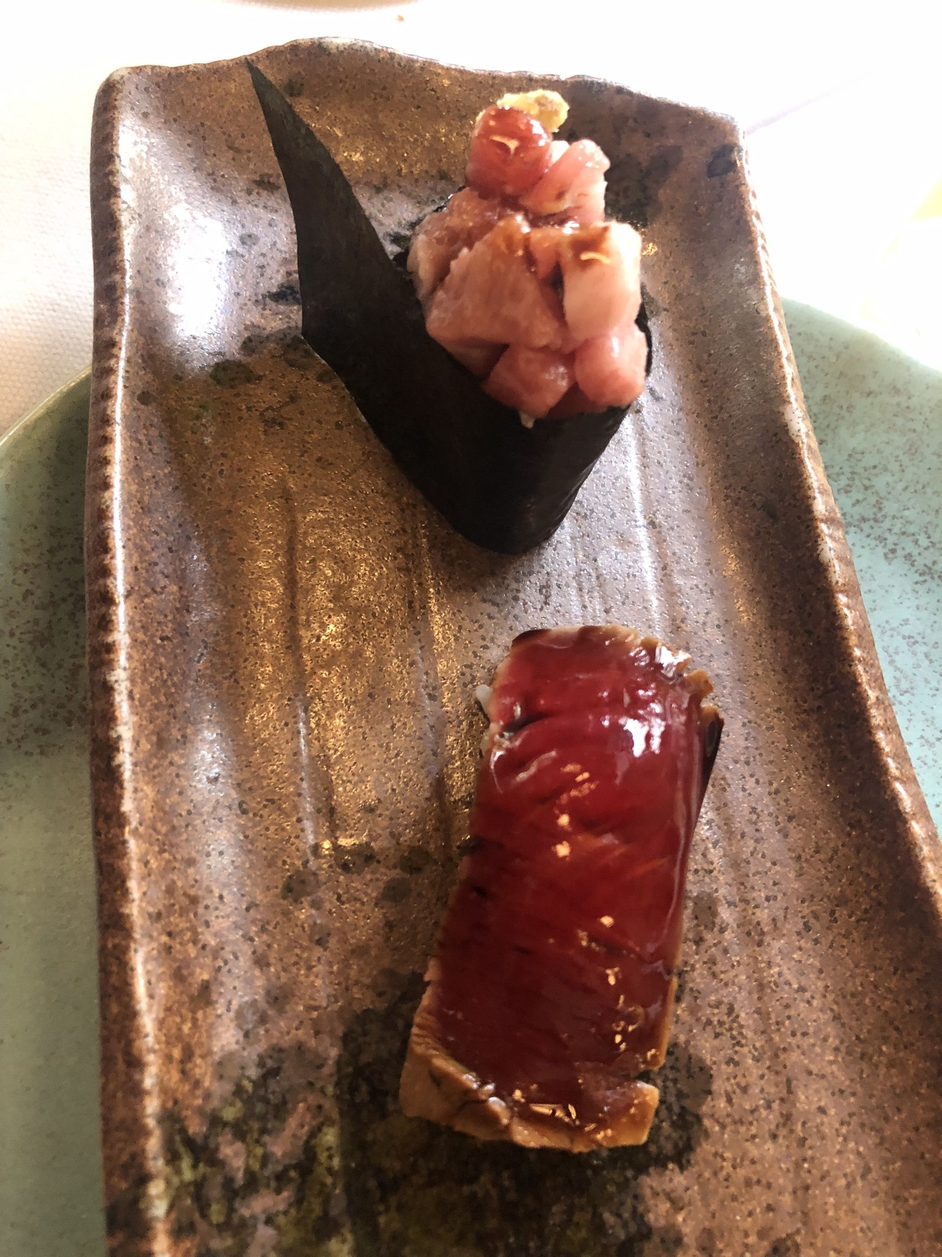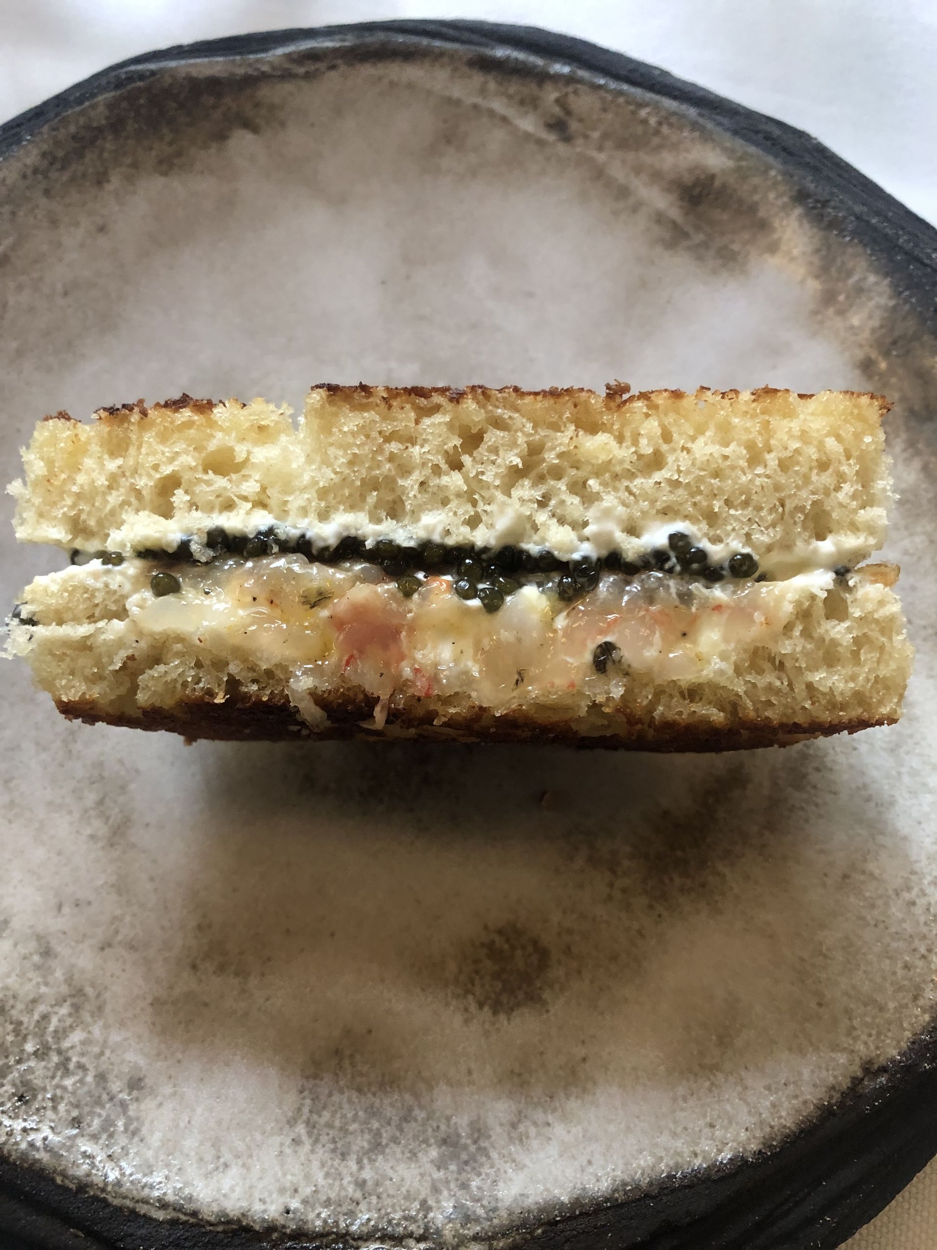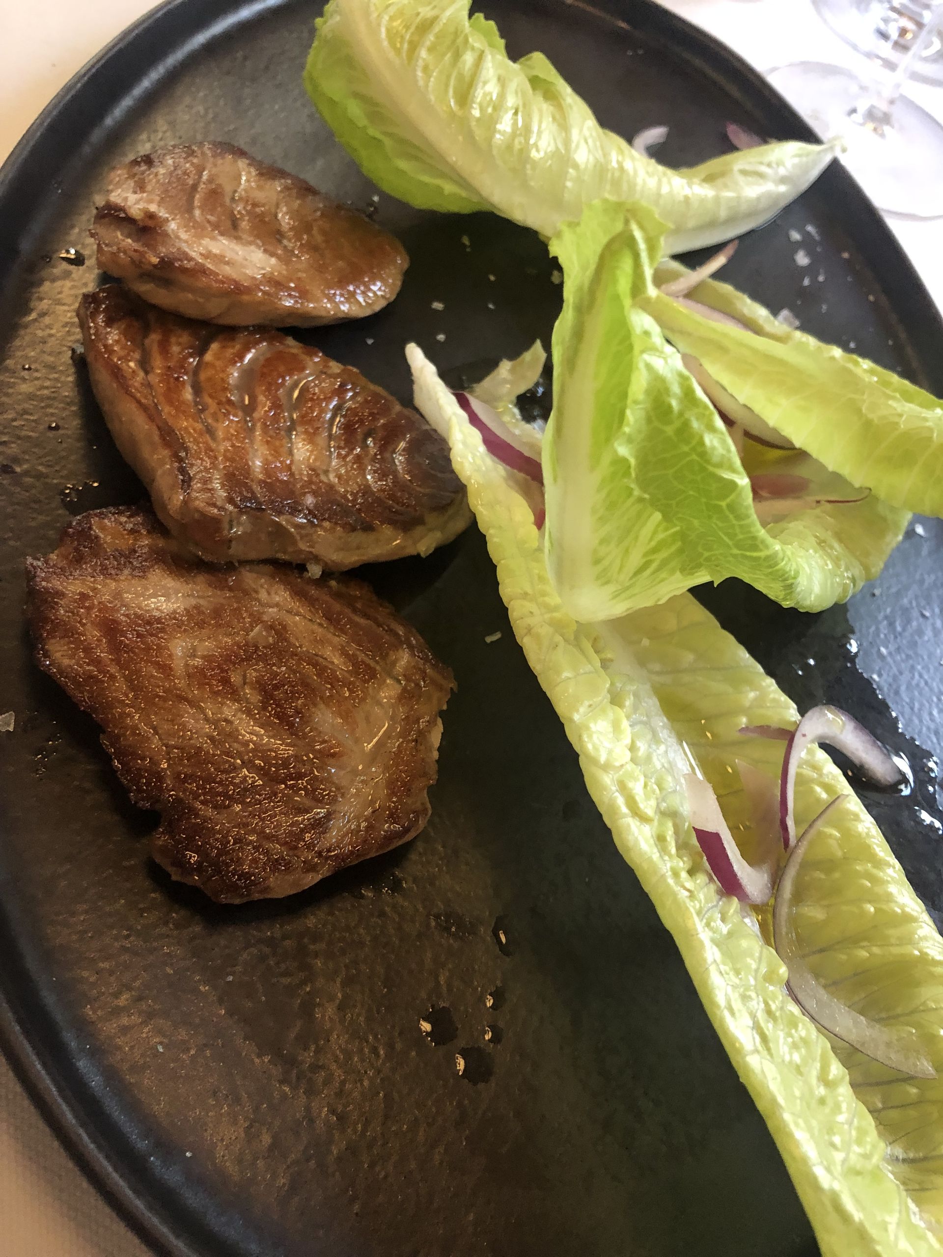 Carrpaccio de carabineros con queso Payoyo, acompañado con piñones, manzana y un ligero toque de mostaza y miel.