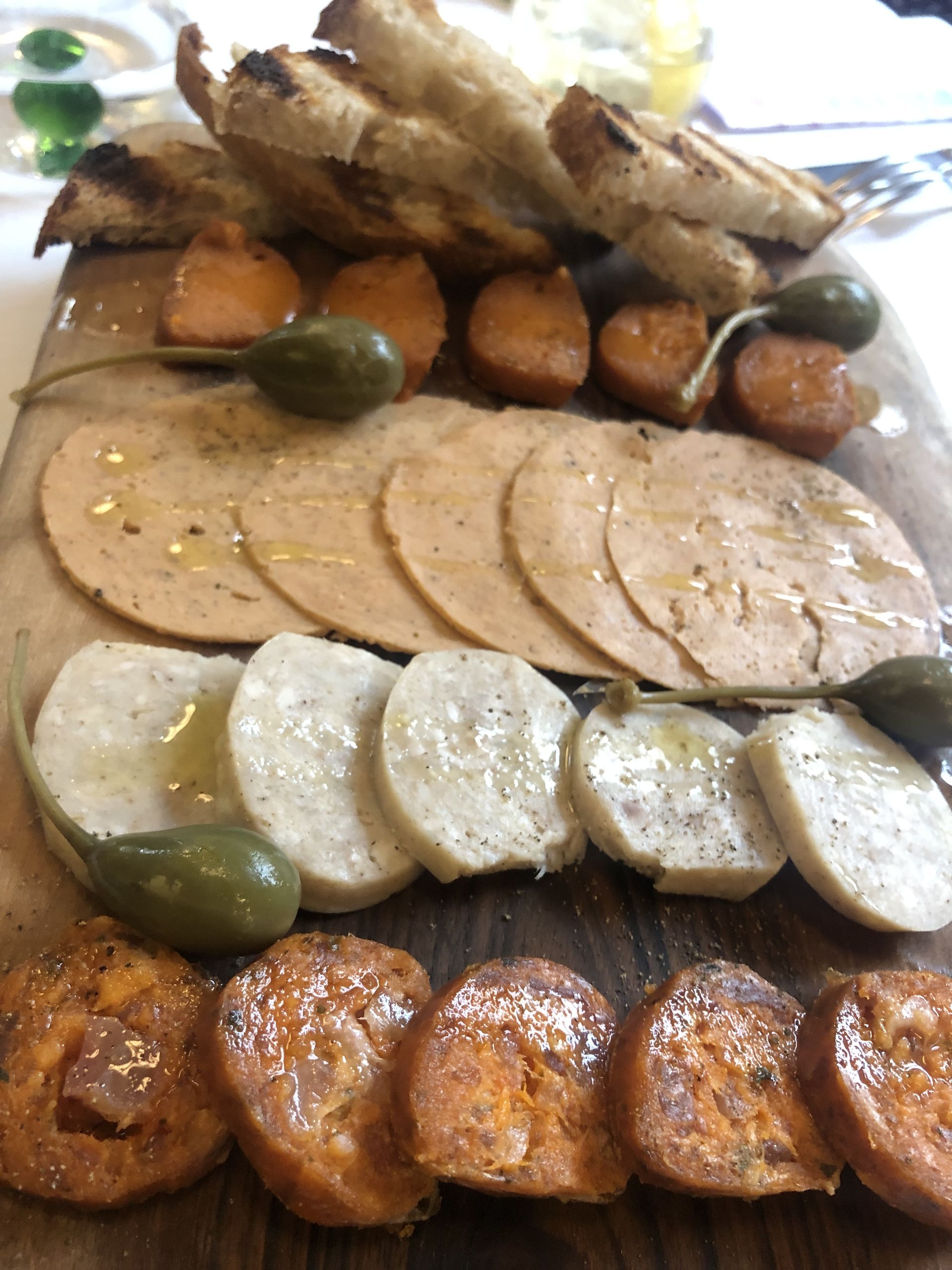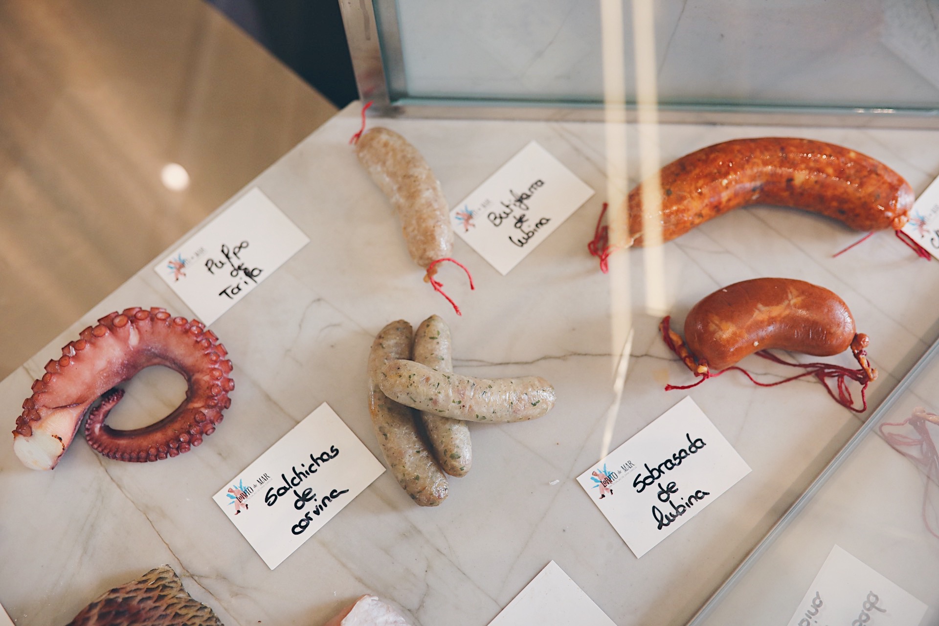 Tabla de charcutería del mar casera, con chorizo, butifarra, mortadela y sobrasada, todo de lubina.