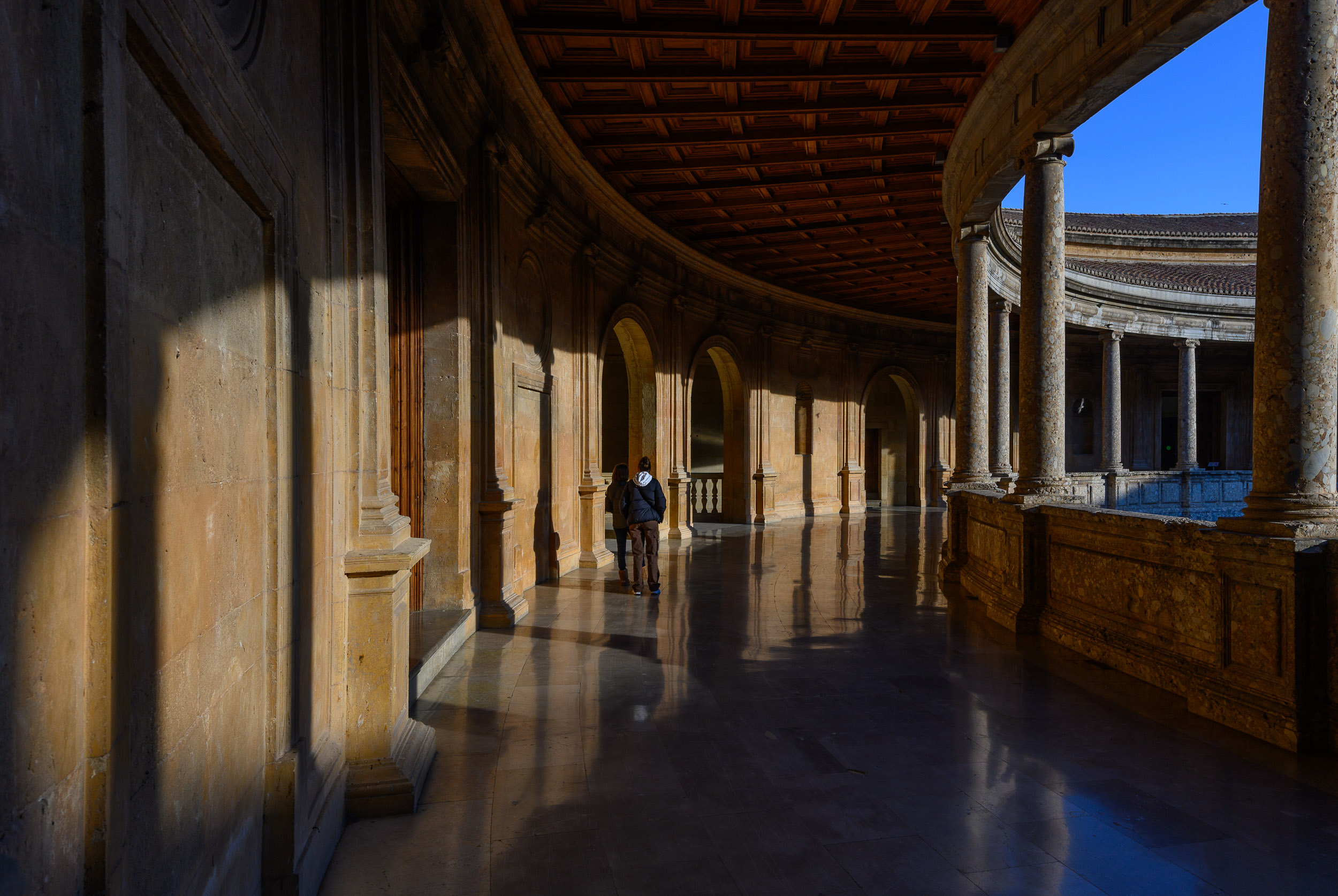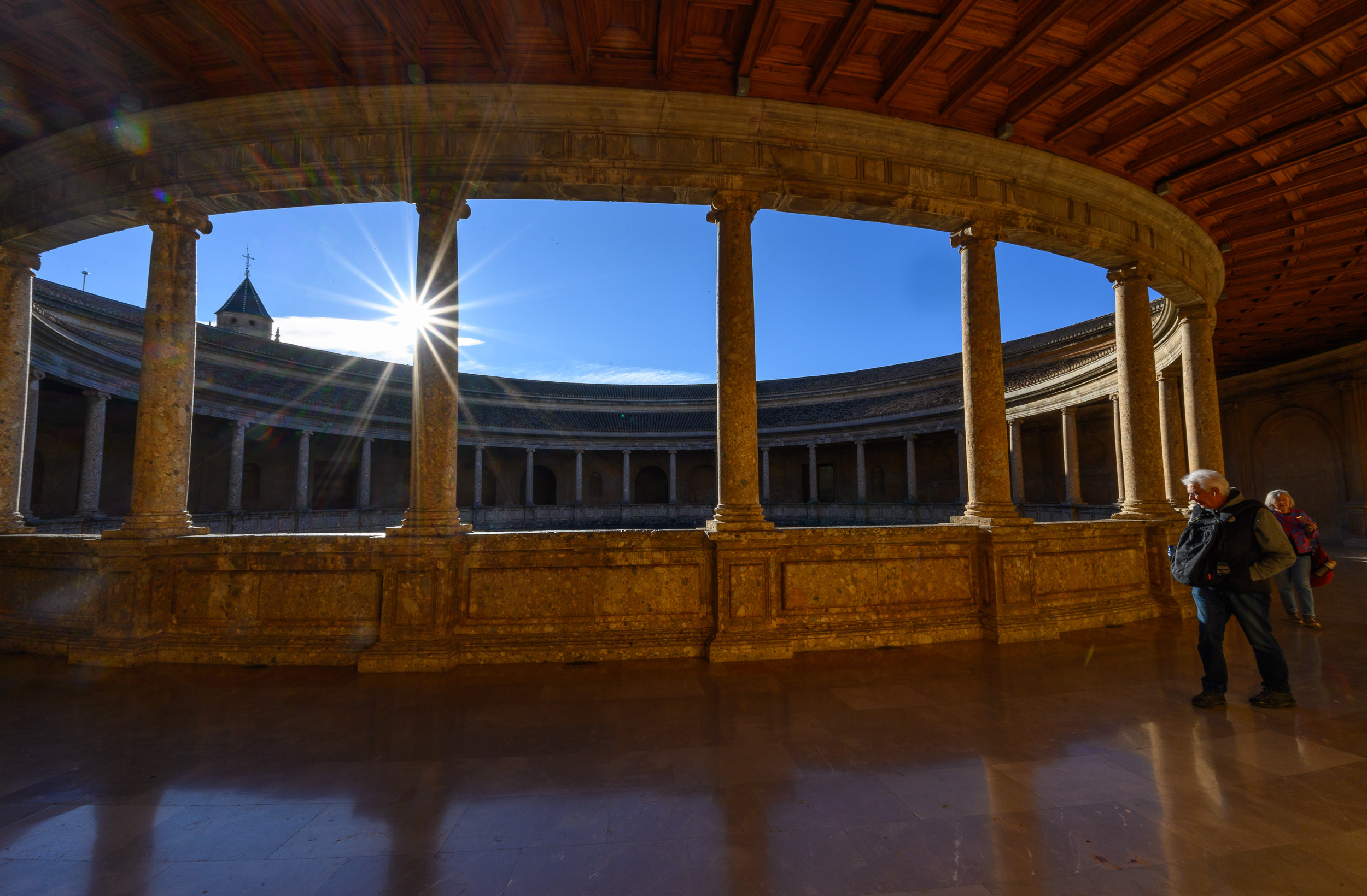 Los primeros rayos del sol en el patio del Palacio de Carlos V.