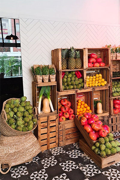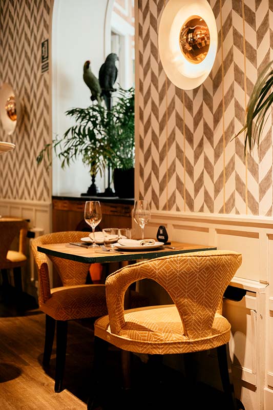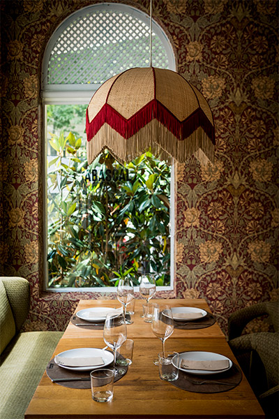 La decoración del restaurante, a cargo de Ainara Arnaiz, como su buen trato en sala, te hará sentir como en casa, con tapices de colores y estampados, papeles pintados con motivos florales y lámparas inspiradas en modelos clásicos pero de fibras naturales y tono llamativos que dan ese toque Boho al restaurante.