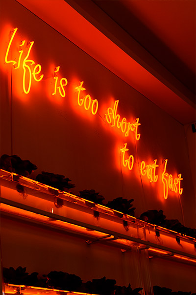 "Life is too short to eat fast" es el neón que te encuentras en una de las zonas del restaurante Abascal y que te invita a disfrutar de la velada con calma porque la vida es muy corta.