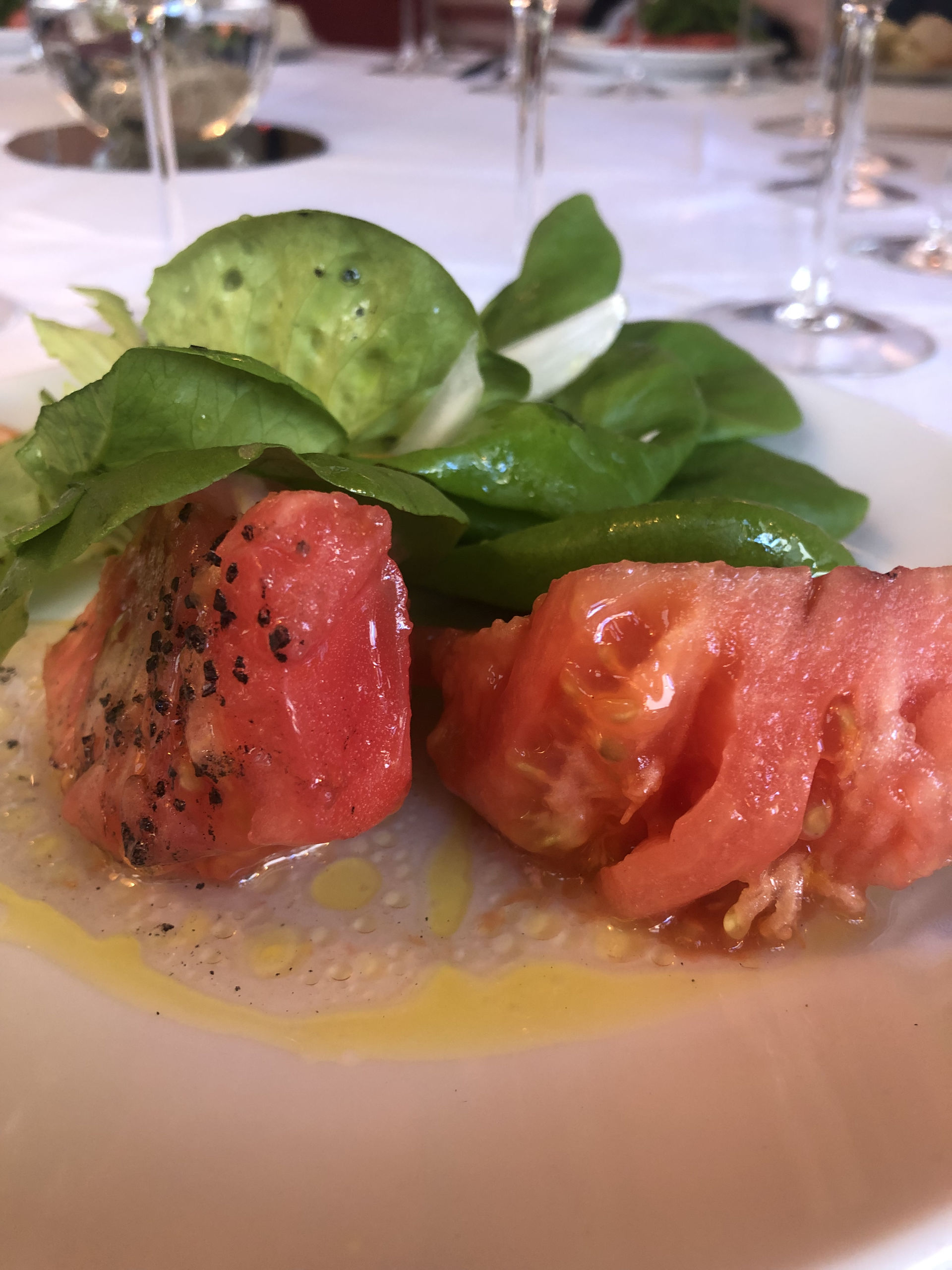 Ensalada de tomate feo de Tudela con aliño secreto y lechuga viva de su huerto vertical.