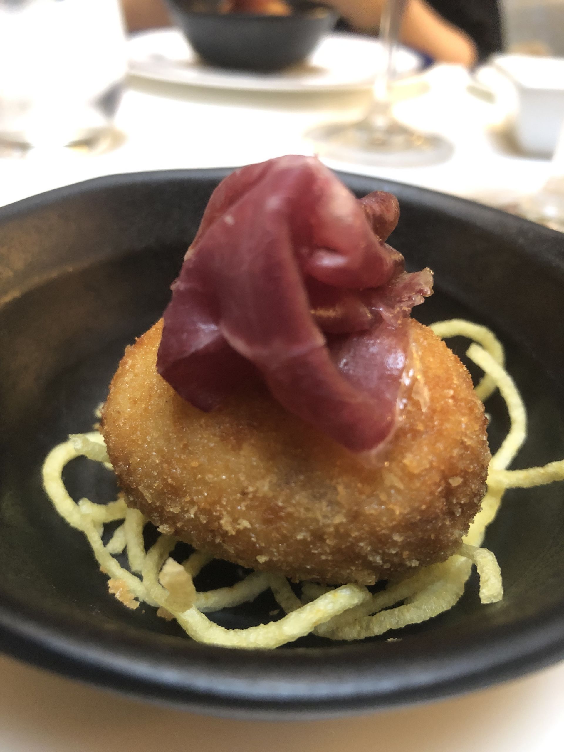 Comenzamos con una muy sabrosa croqueta cremosa de leche fresca y cecina de León, para continuar con un muy buen ajoblanco de almendras con tartar de tomate semiseco y anchoa ahumada del Cantábrico. Los tomates y la anchoa le dan un estupendo toque salado a la crema fría que te la sirven en la mesa.