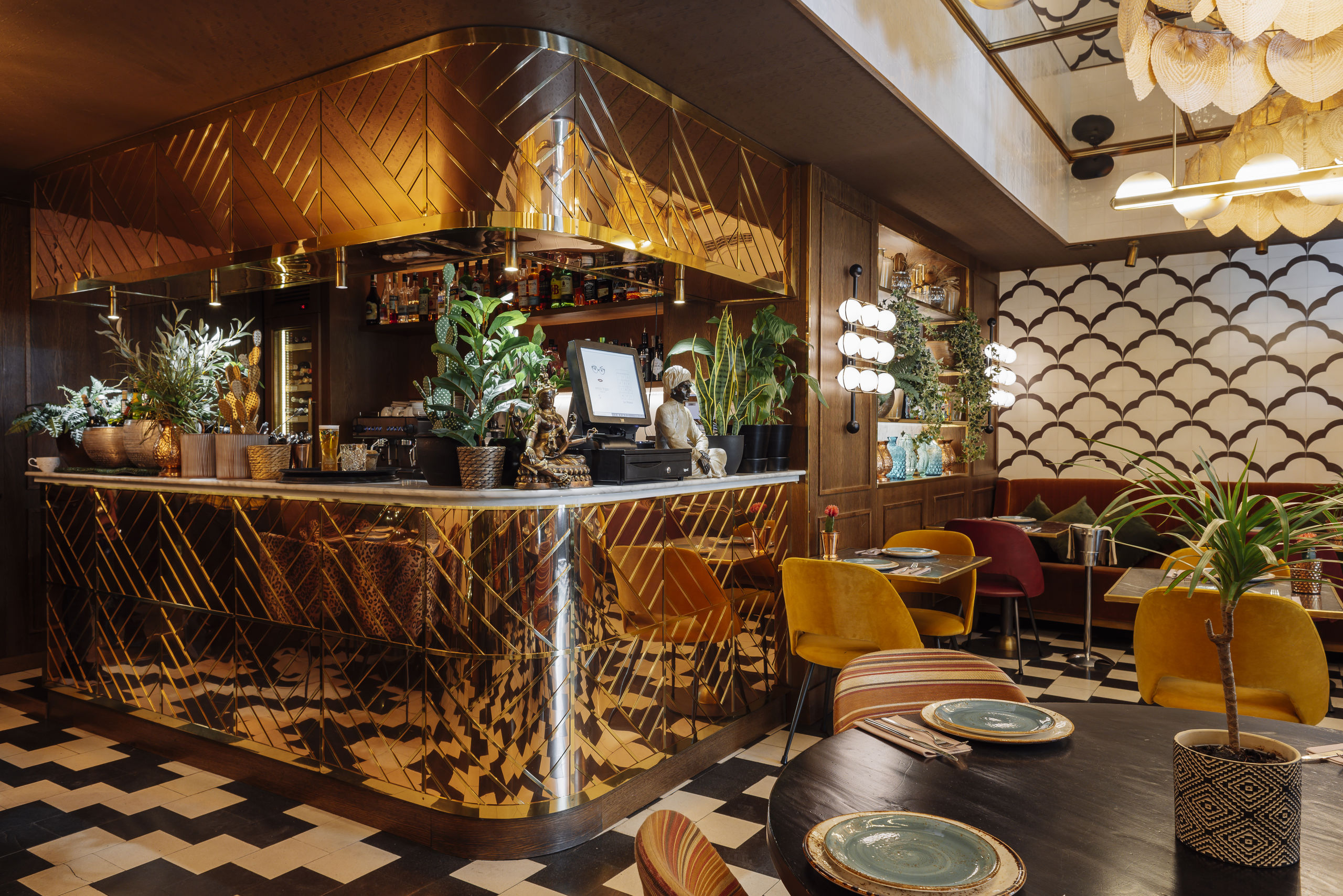 En la barra y el techo de Bangalore predominan el espejo y el latón, dando el efecto típico de las celosías indias.