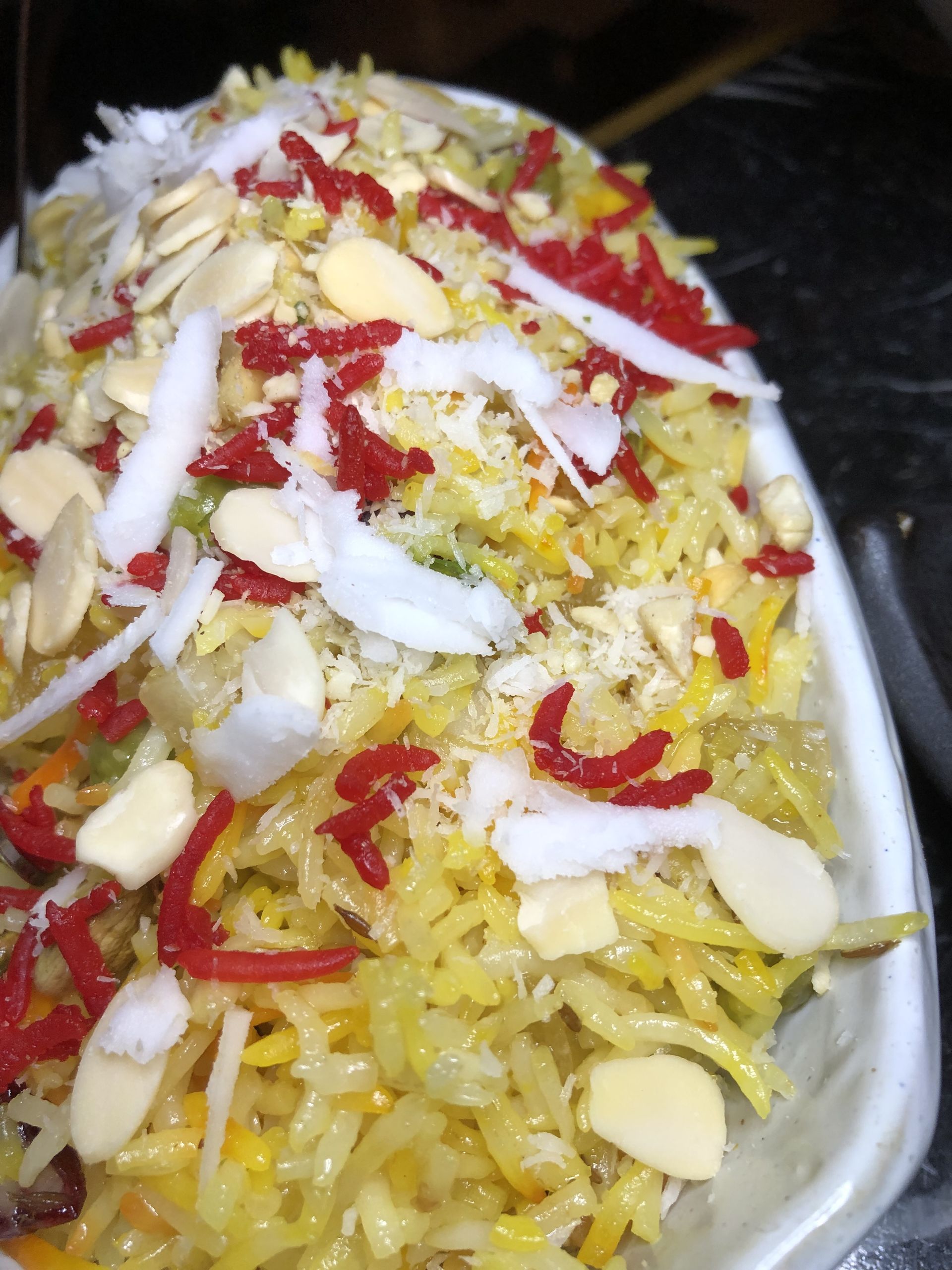 kashmiri rice, un arroz basmati con especias aromáticas, frutos secos y azafrán.