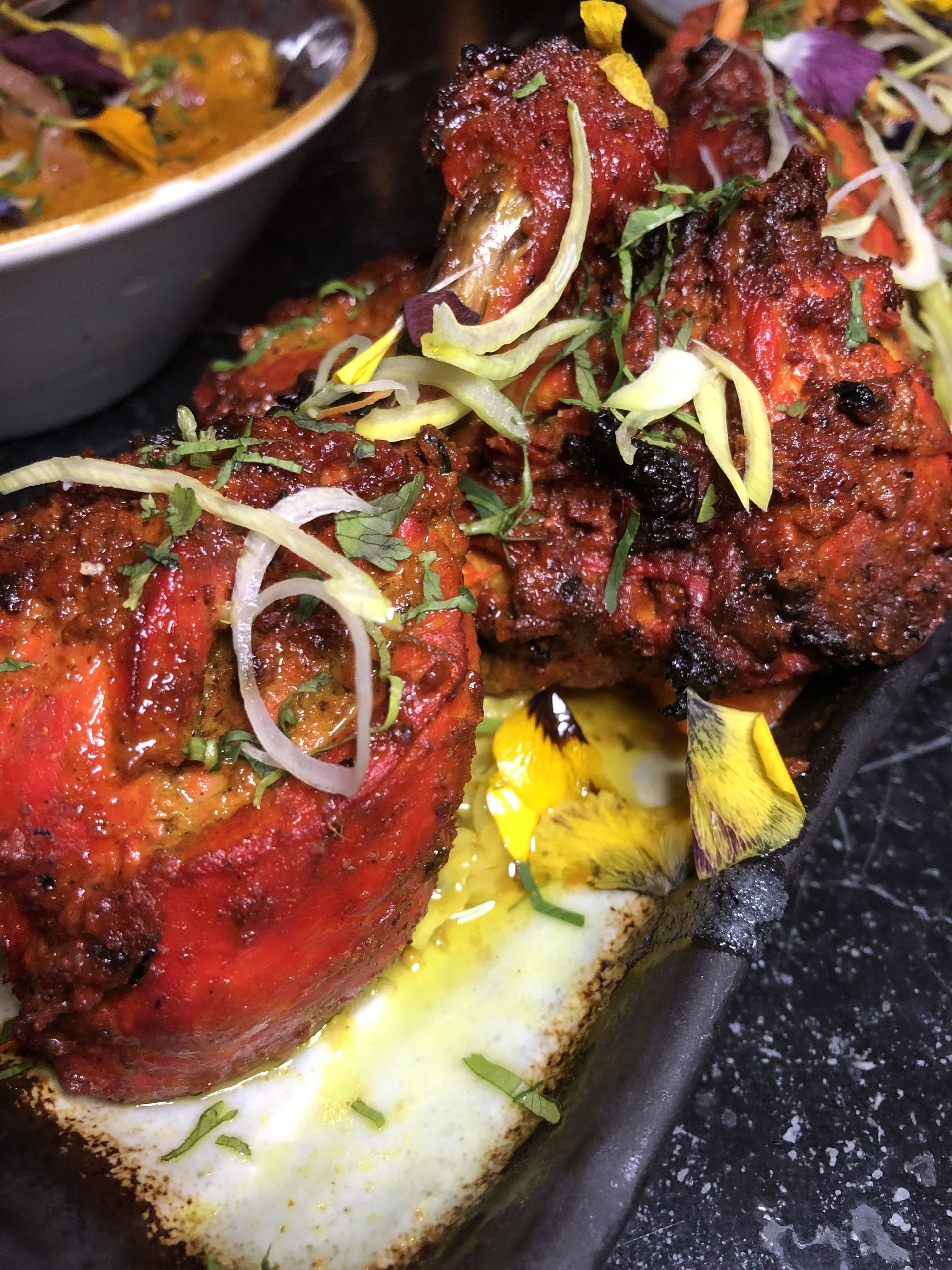 Chicken tikka, estupendo pollo troceado y adobado con hierbas y especias, como no podía ser de otra forma, preparado en el horno tandoori de Bangalore.