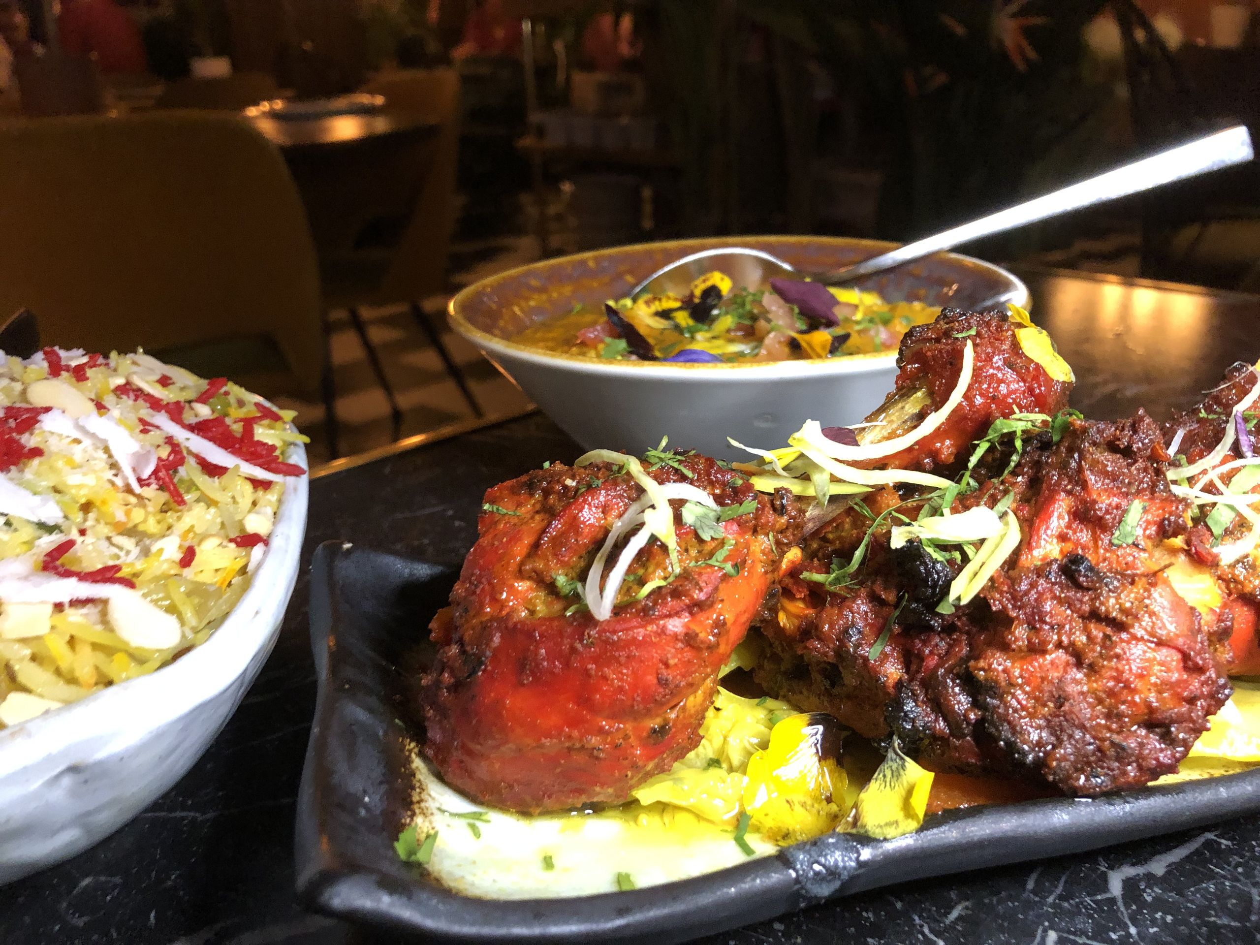 El chicken tikka, el lamb madrás y el kashmiri rice de Bangalore.