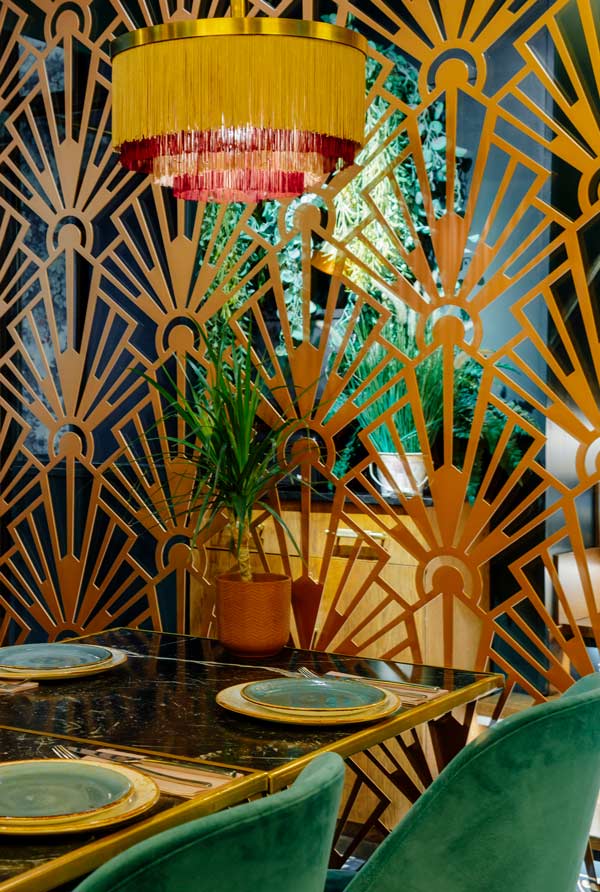 La barra de Bangalore destaca por estar revestida de espejo y latón, lo que la otorga efecto típico de las celosías indias.