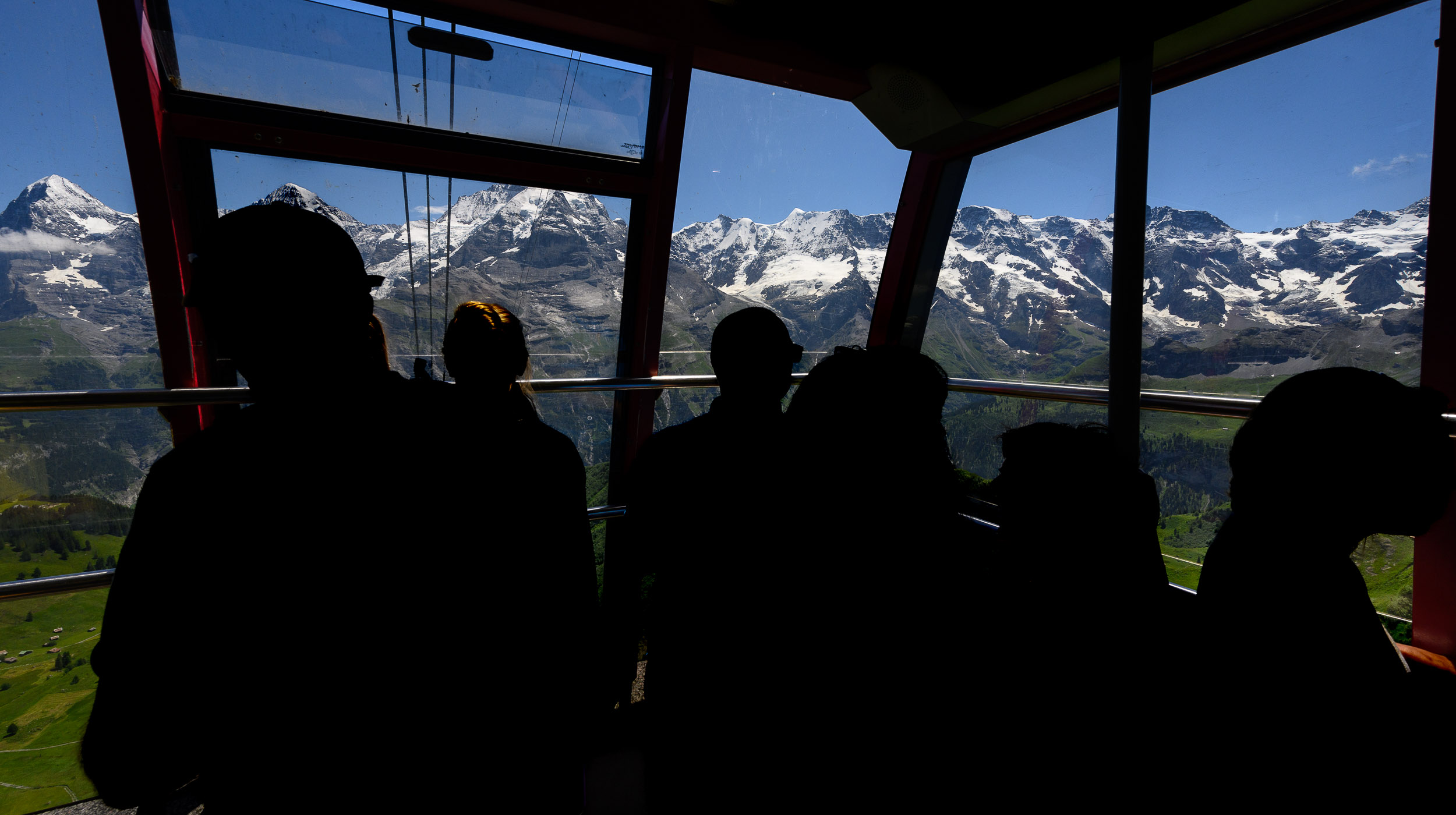 La cabina del teleférico llegando ya al Schilthorn y con el impresionante paisaje de fondo.