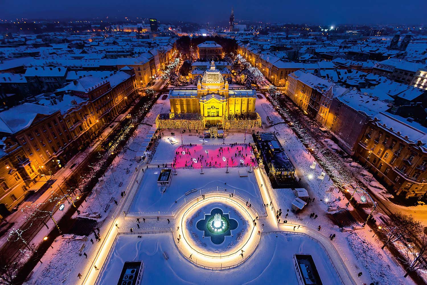 El mercado de Navidad más llamativo de la capital de Croacia se ubica en el corazón de la ciudad, en la inmensa plaza del Rey Tomislav, frente a la estación de trenes. La principal atracción de este mercadillo en las fechas navideñas es una enorme pista de patinaje sobre hielo, además, muy cerca se pueden escuchar villancicos al aire libre en el monumental Pabellón de Música construido en 1891. A los pies de la catedral de Zagreb, al norte de la ciudad, se puede disfrutar de un curioso belén viviente que sorprende a quienes lo visitan. Y si se visita la ciudad en Adviento, además de vagar por los numerosos puestos de comida, artesanía, bebidas calientes, etcétera, no se pueden dejar pasar los dulces típicos del país: los licitari, las galletas de miel, los paprenjaci, galletas de pimienta algo picantes o las vanilin Kiflice, parecido a unas rosquillas de vainilla.