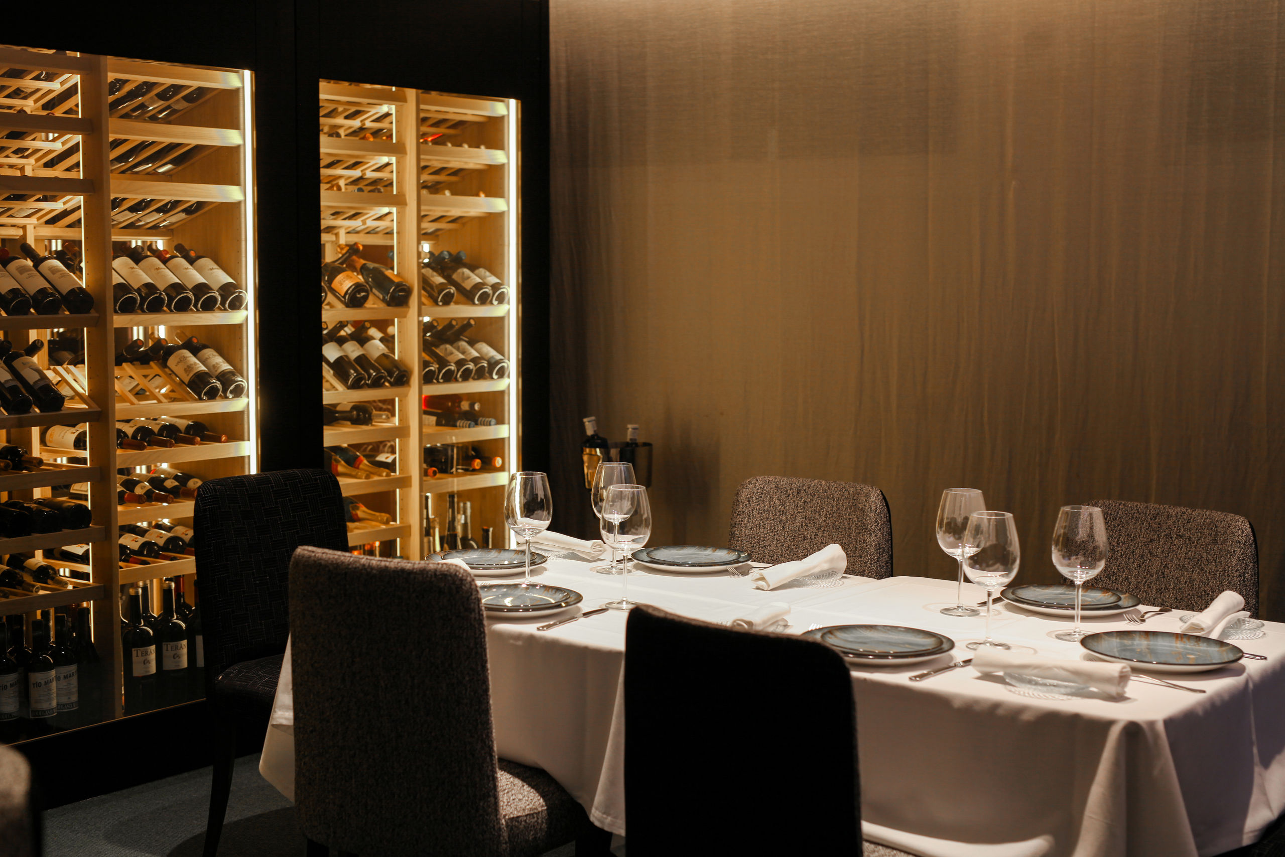 En la parte baja del restaurante puedes comer junto a la cava en la que se aprecian algunas de las más de 300 referencias de vinos nacionales e internacionales.