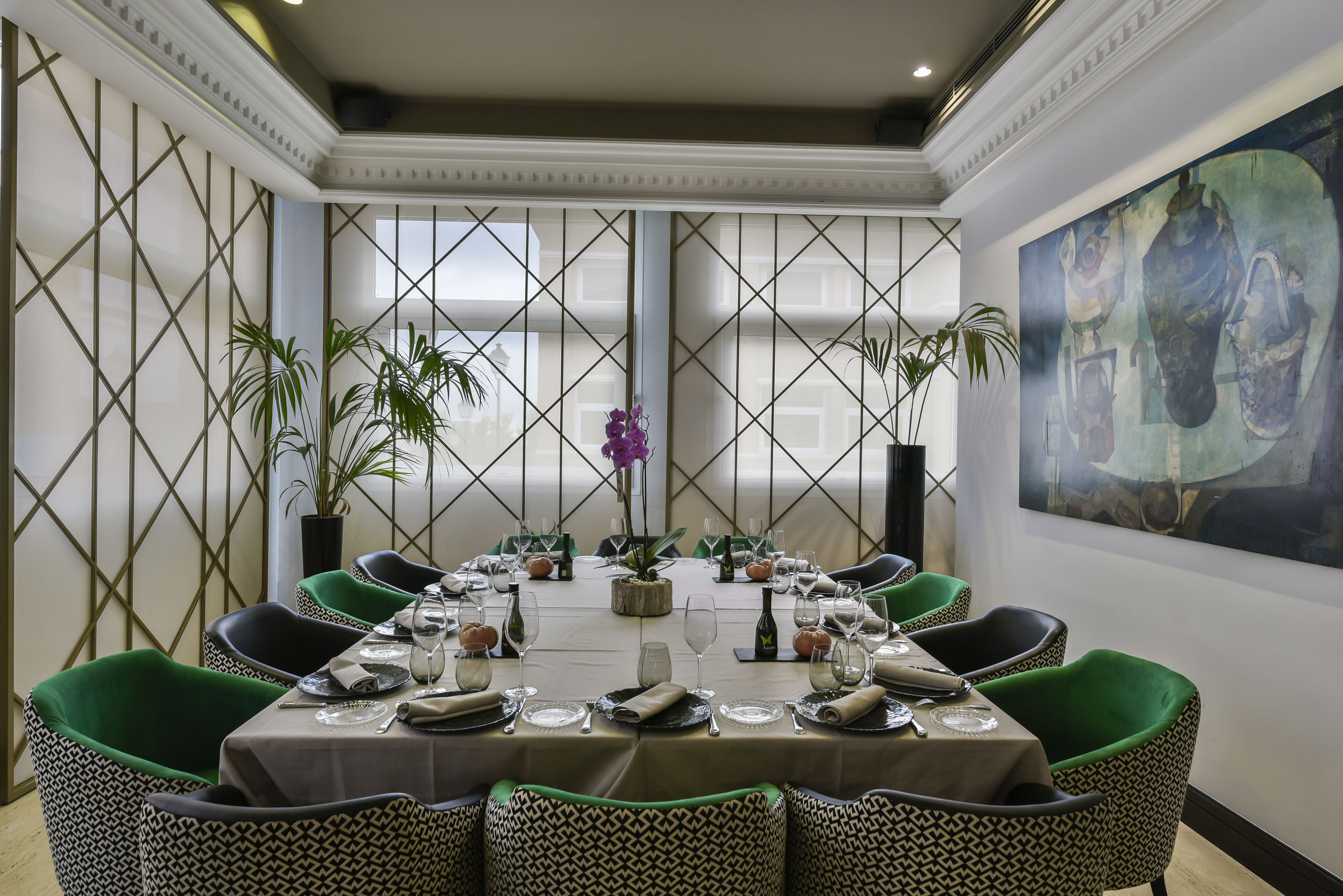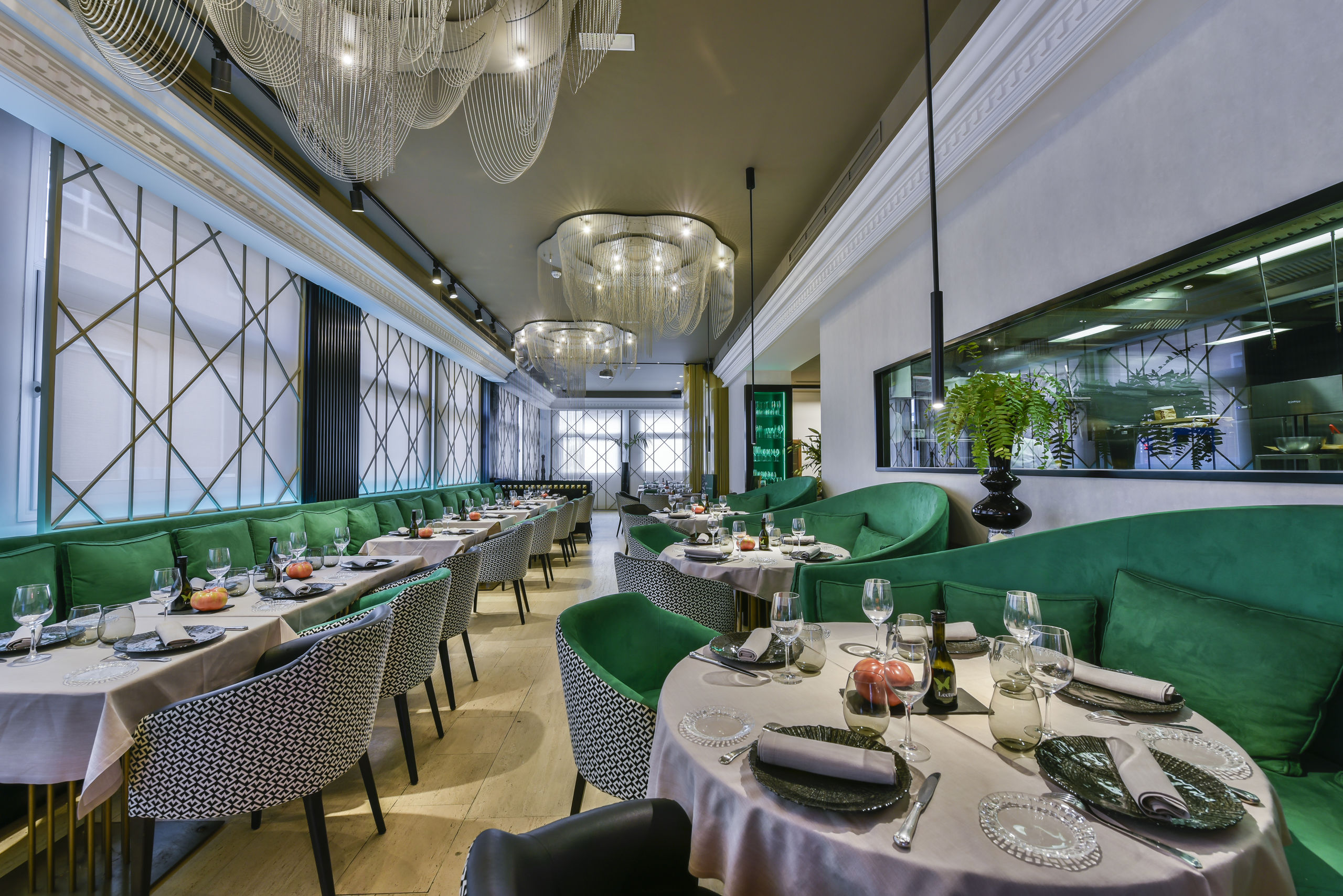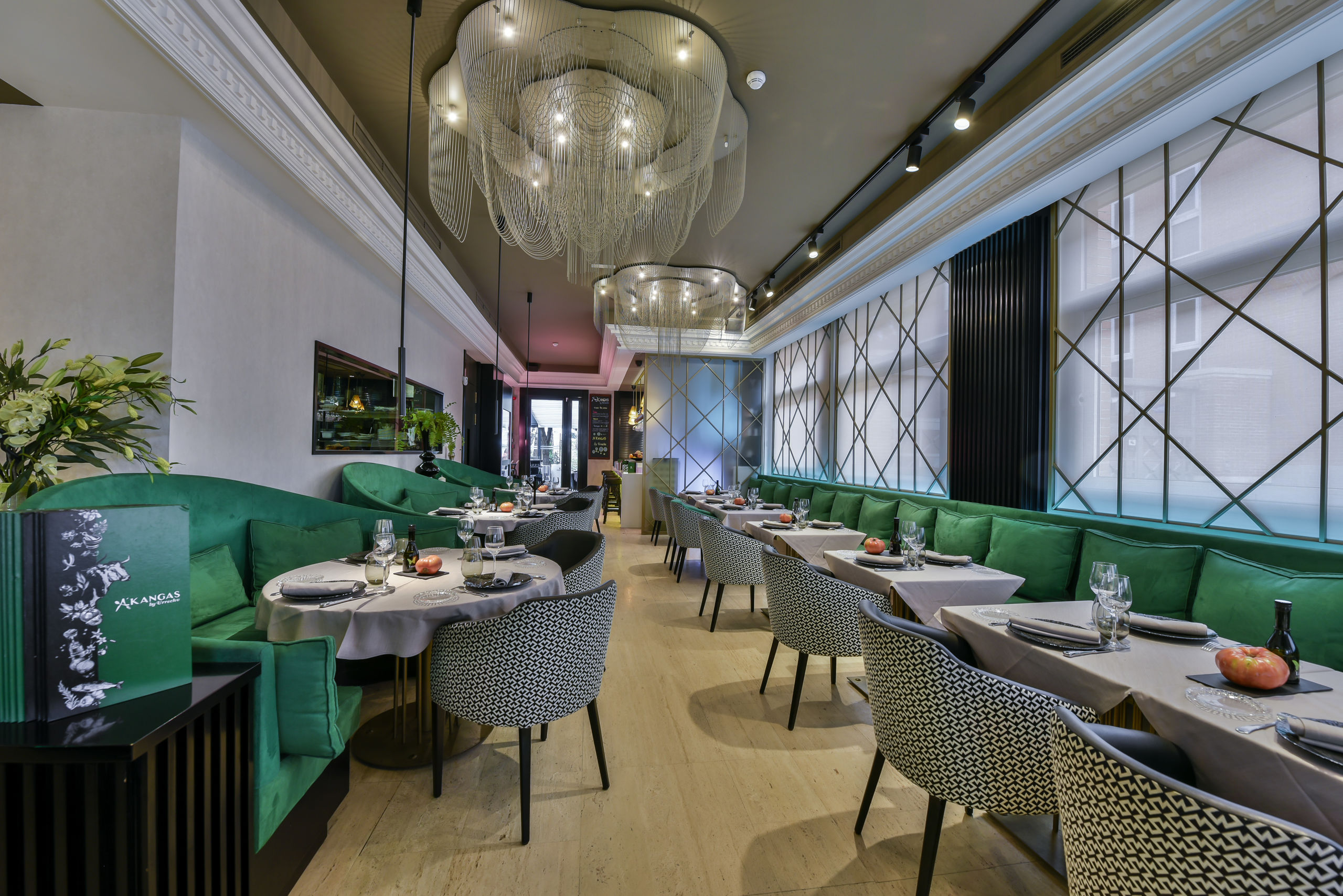 A’Kangas by Urrechu cuenta con un ambiente moderno en el que predomina el color verde del tapizado de sillones y butacas.