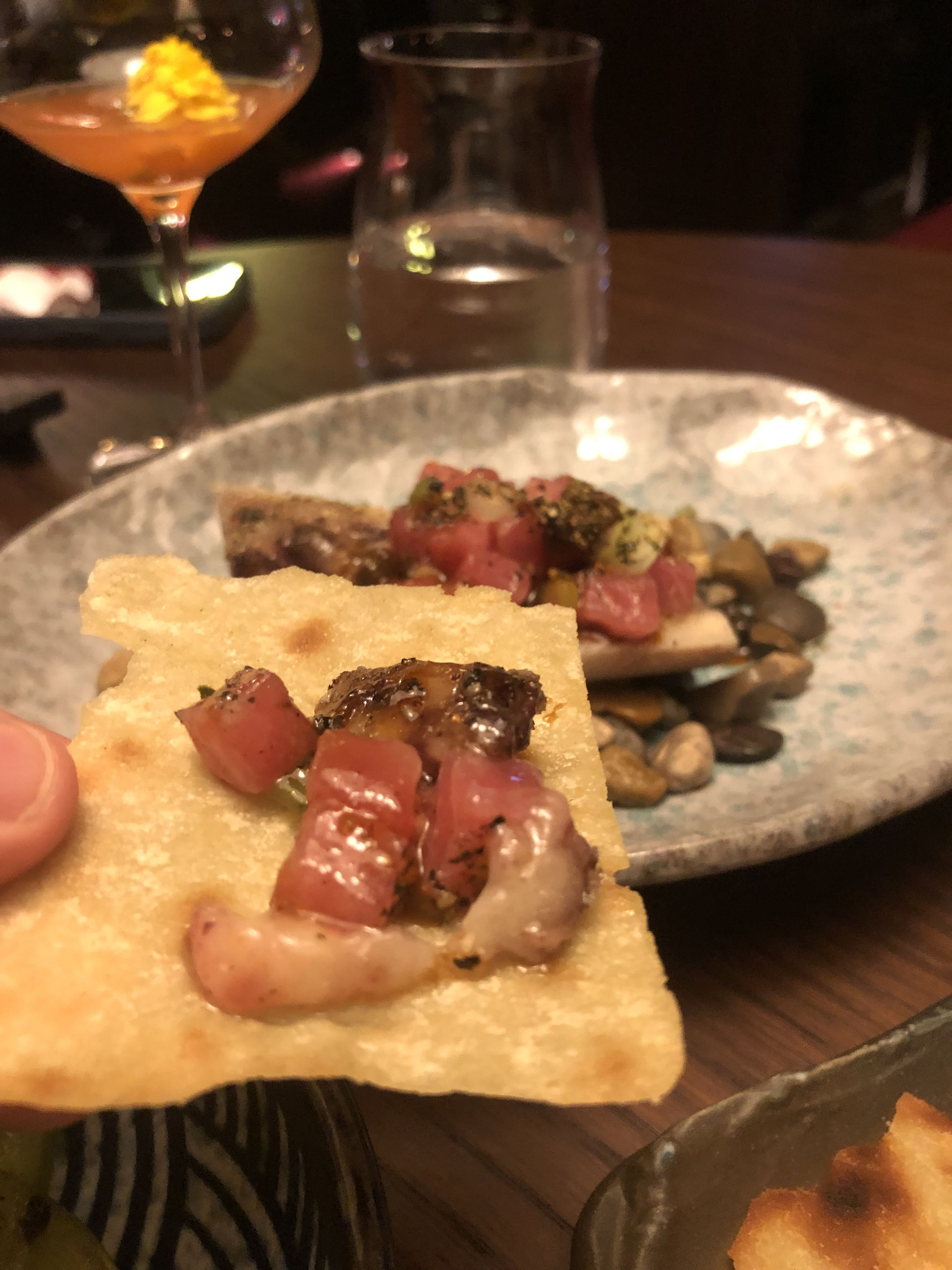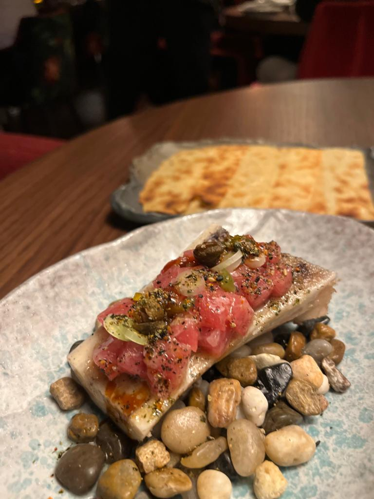 Estupendo tartar de atún sobre tuétano de Le Kañí, un manjar que mezcla perfectamente el túnido con la gelatinosidad del tuétano y su gran sabor.
