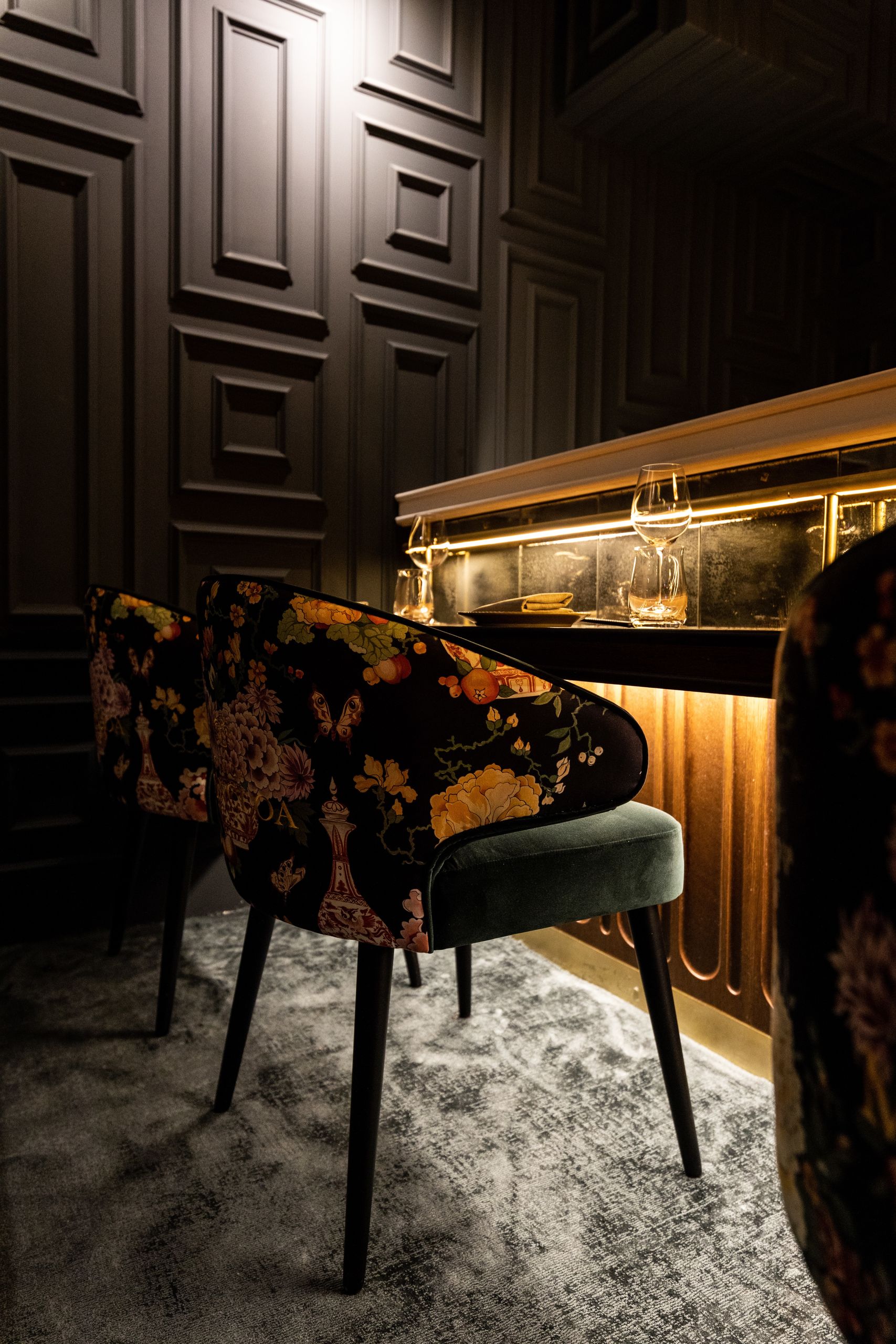 La decoración de Le Kañí destaca por su elegancia moderna (luces tenues, tapicerías de terciopelo en tonos granate y verde oscuro, grandes lámparas con tulipas de tela y flecos) y cierto ‘rollo’ de lujo exótico (panteras salvajes e insectos dorados, vegetación)