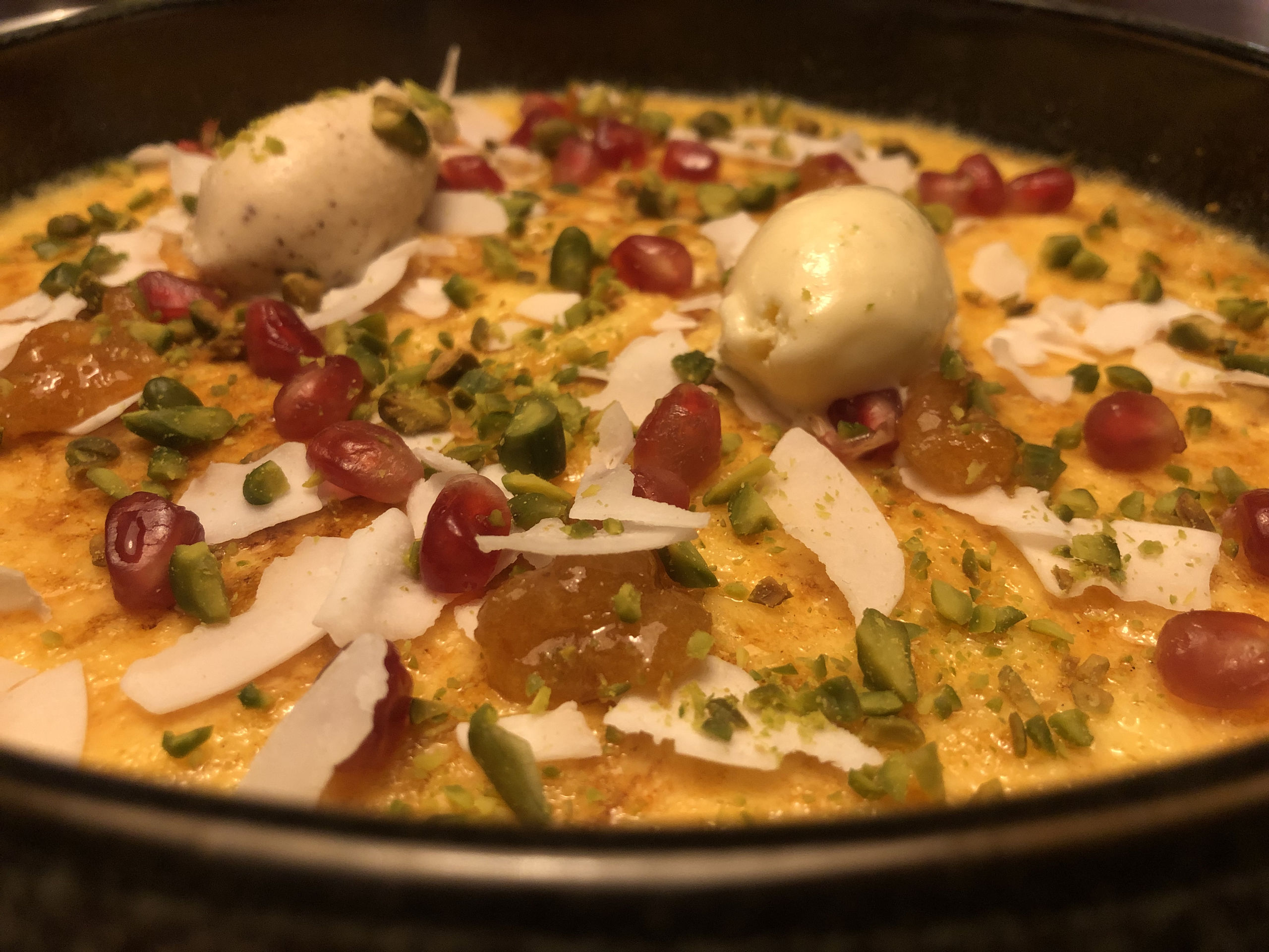 Muy buena crème brûlée asiática con helado de pimienta de Sichuan.