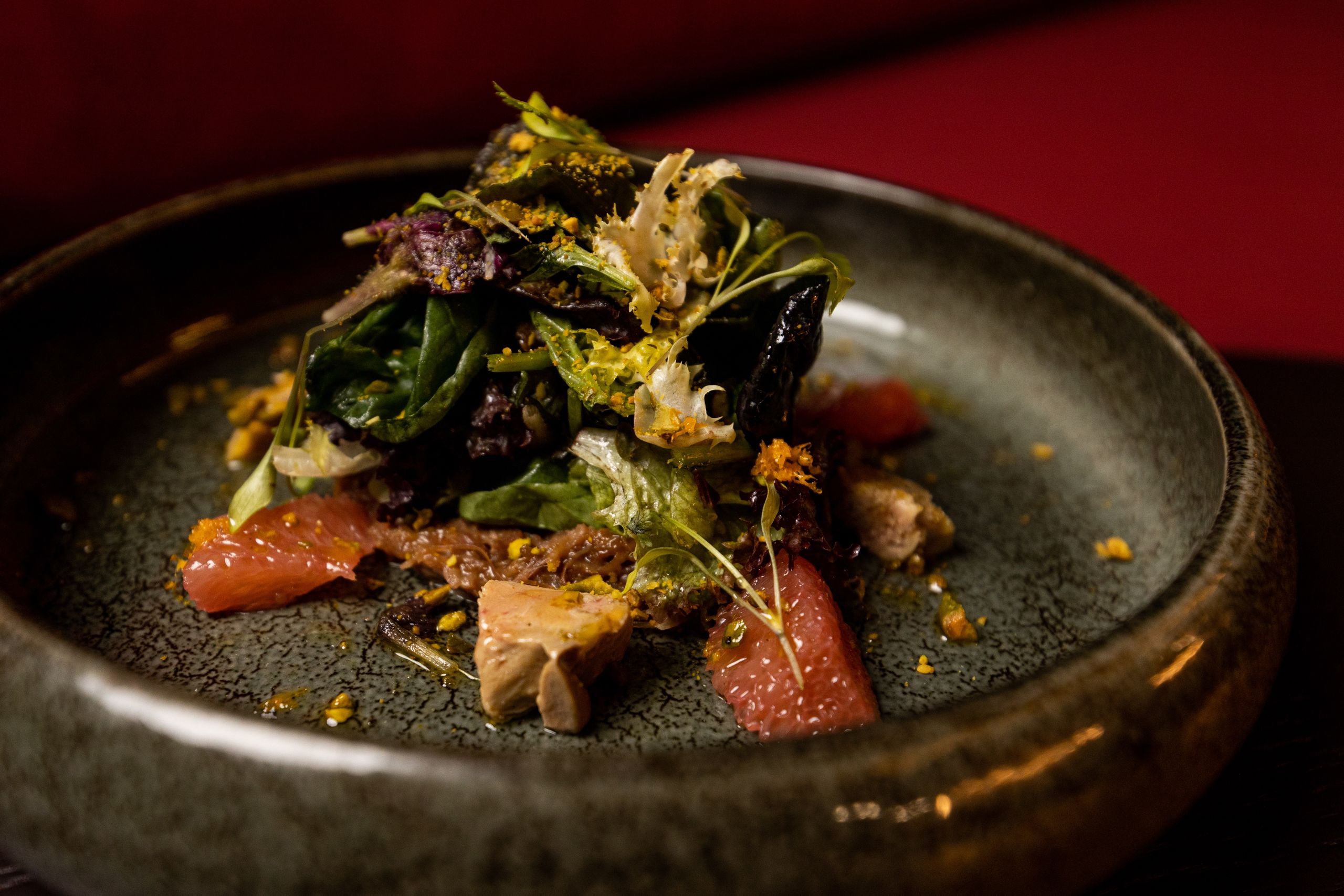 Ensalada de canard l’orange con foie y pistaccios de Le Kañí
