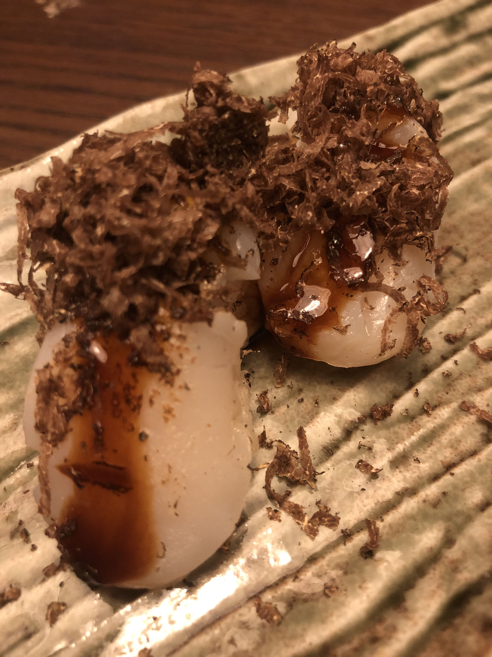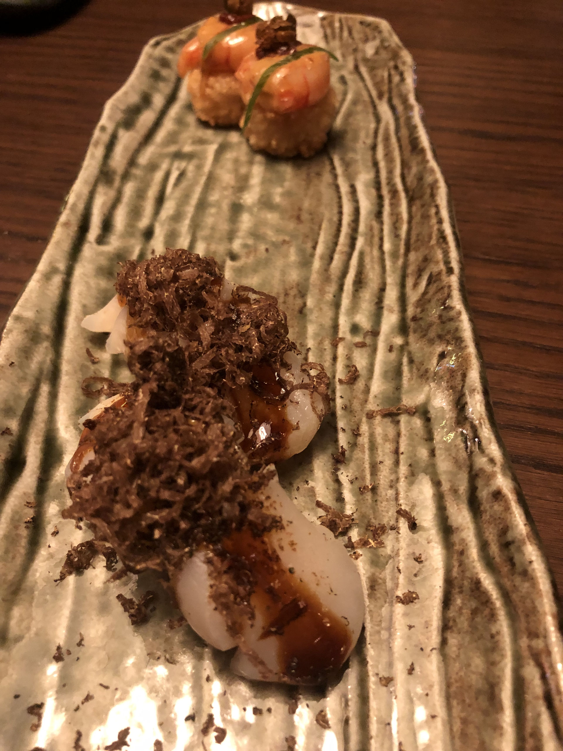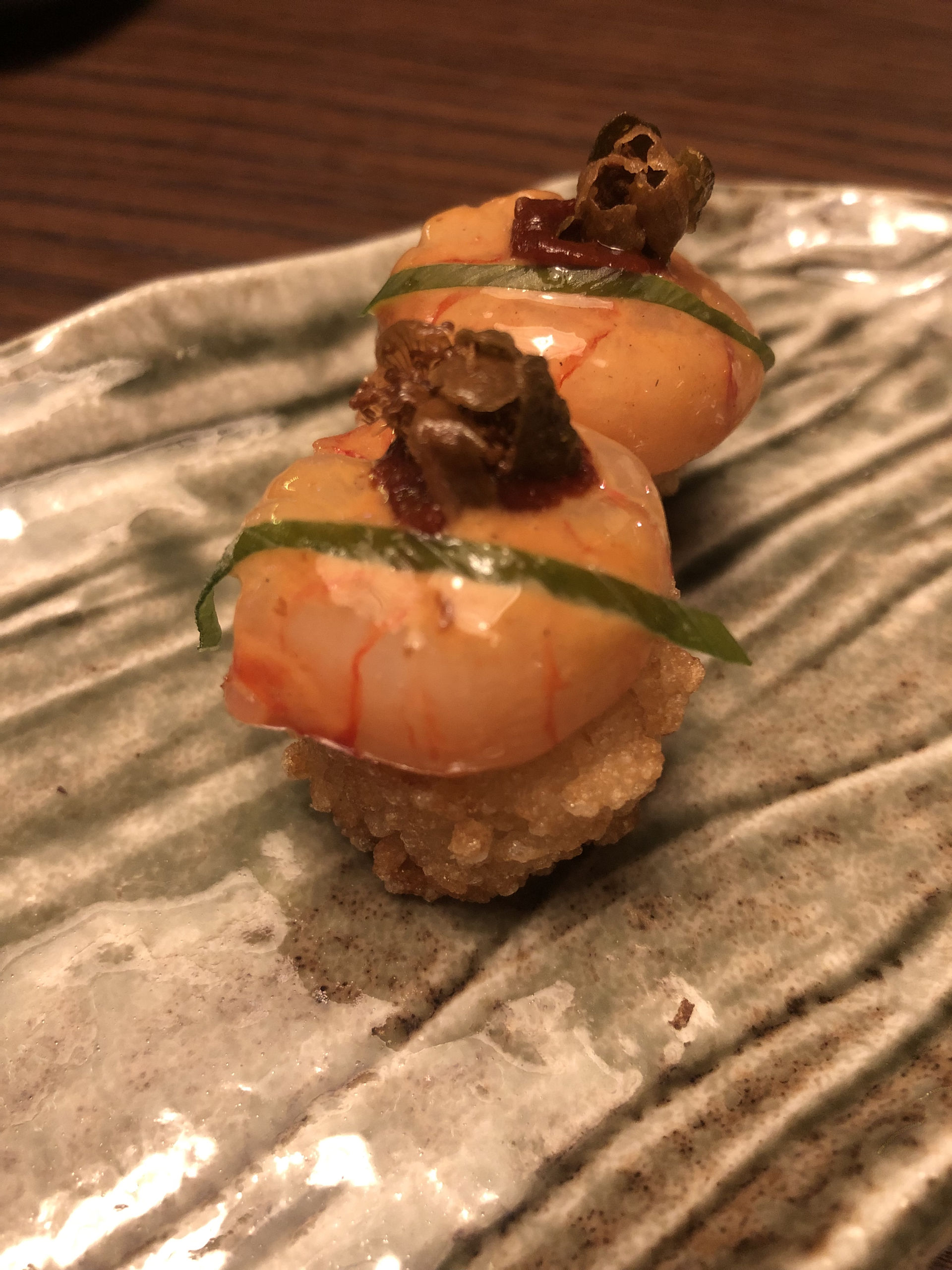 Niguiri de vieira con trufa y niguiri de gamba roja crispy rice de Le Kañí.