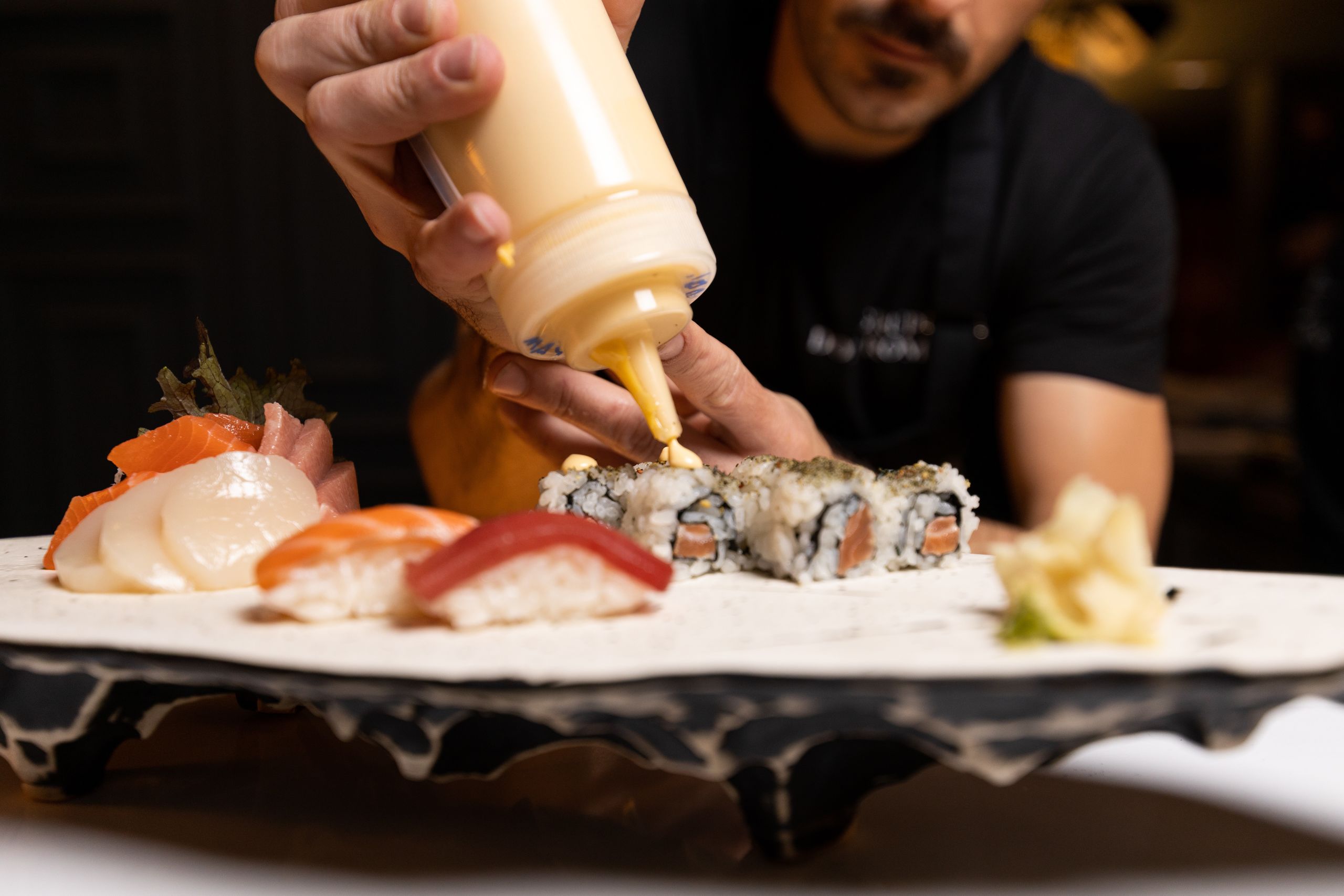 El chef termina de emplatar esta degustación de sushi de Le Kañí.