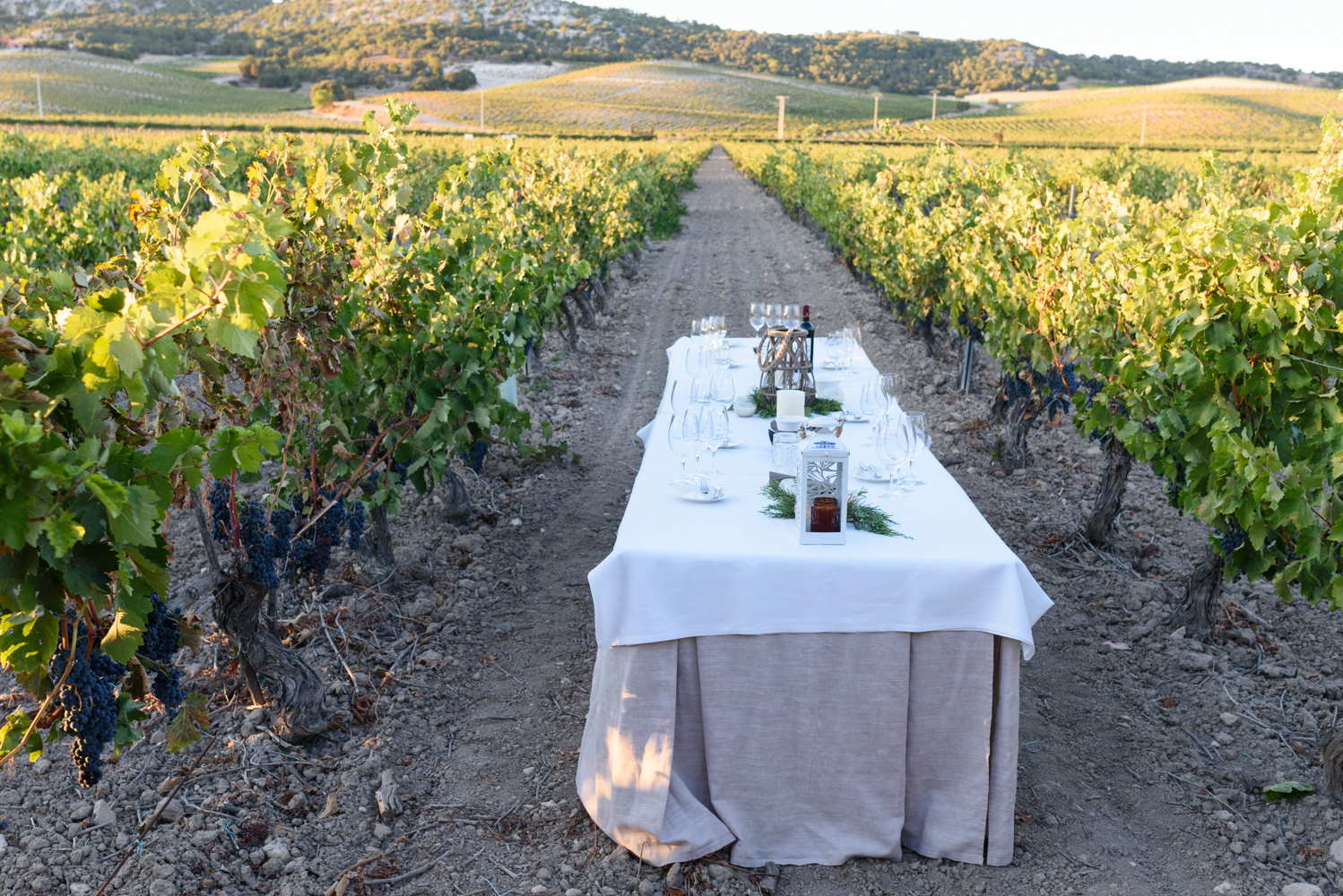 Una vista del viñedo de la bodega Dehesa de los Canónigos en Ribera del Duero, antes de la vendimia. Una de las propuestas de esta bodega consiste en realizar una cata en mitad del viñedo, durante la puesta del sol para apreciar el cambio que experimenta el vino durante al atardecer y al aire libre.