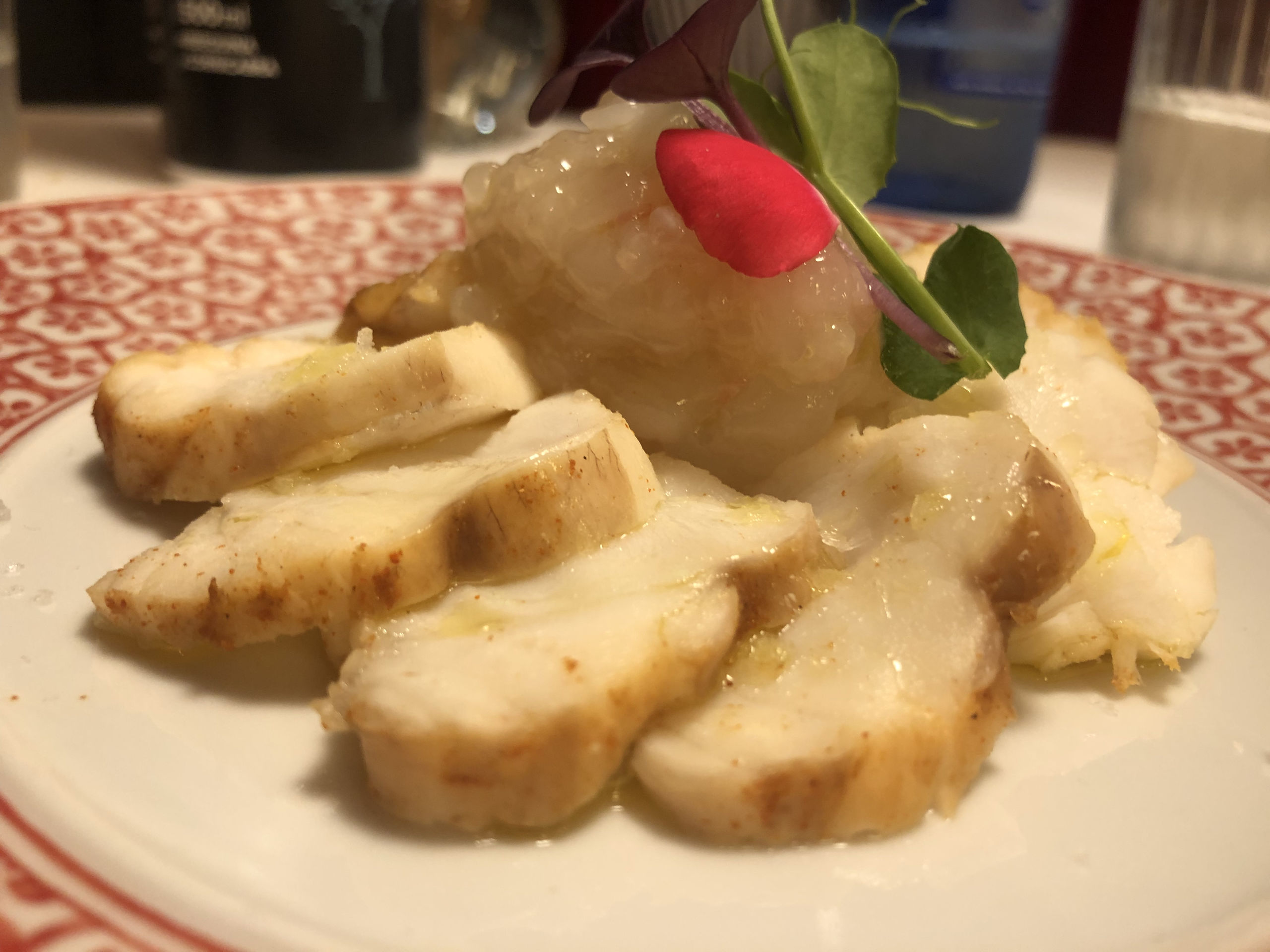 Rape alangostado con tartar de cigala que, aunque cuenta con un producto de primera calidad le falta algo que potencie el sabor de un pescado de agua salada que a pesar de todo ya de por sí es algo soso.