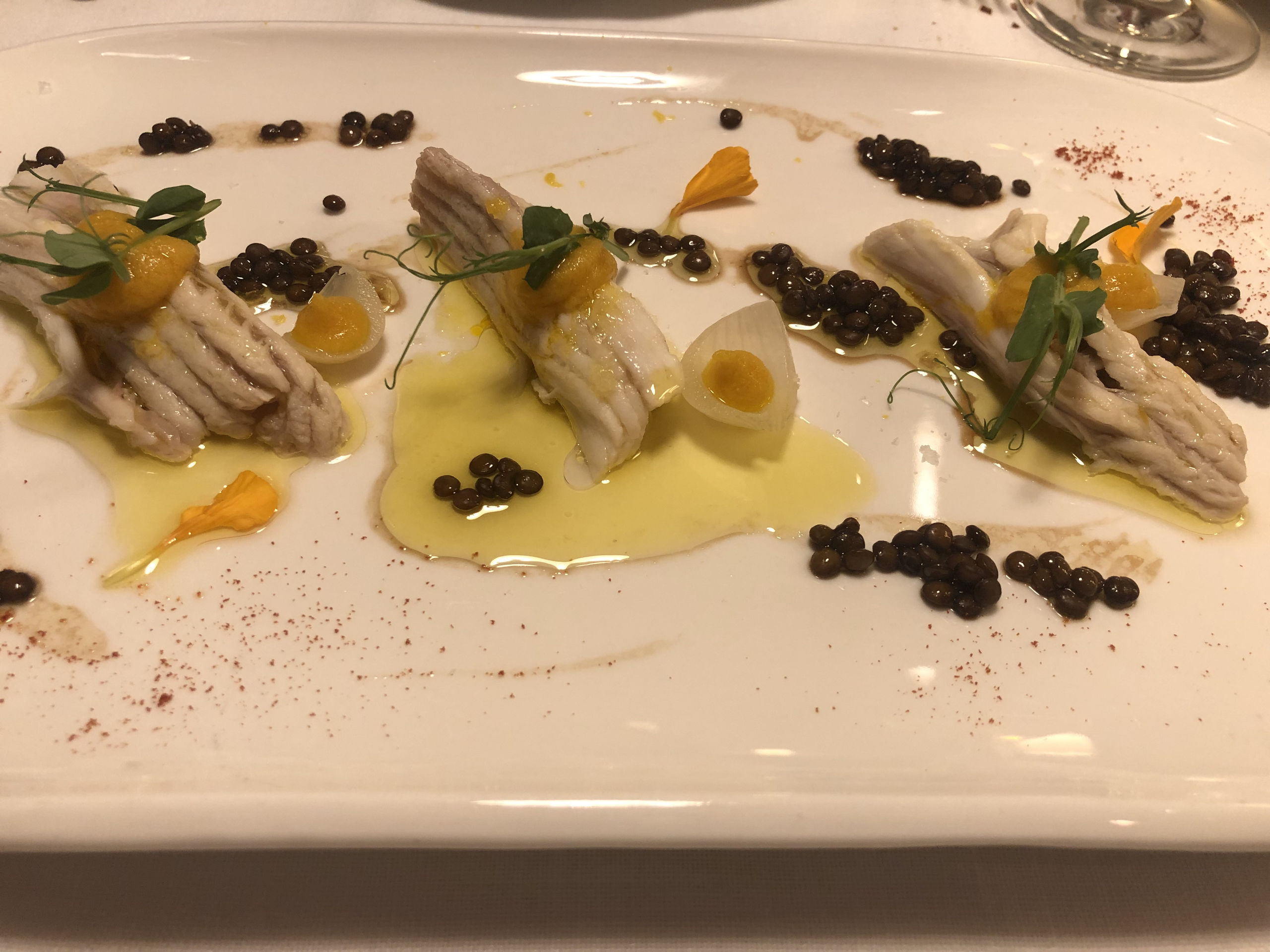 Exquisita raya escabechada tibia con vinagreta de lentejas, un pescado delicioso, con un matiz cárnico que me fascina y bien acompañado por la salsa y el toque 'crunchi' de las lentejas.